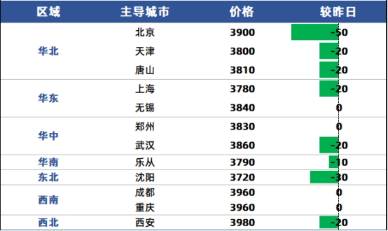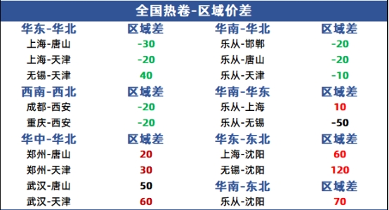 南北区域价差窄幅波动。上海-唐山价差-30元,上海-天津价差-20元,乐从-邯郸价差-20元,乐从-唐山价差-20元。