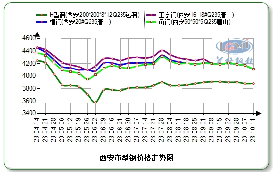 今日西安型钢价格继续下挫,期螺偏弱震荡,终端谨慎入场采购,成交未有起色。钢厂方面,昨日普碳方坯价格降30元,唐山市轧钢企业成材出厂价格普遍下调30-40元,晋南钢铁工字钢、槽钢、角钢价格下调20-40元,H型钢持稳。市场方面,连续几日成交表现不佳,场内贸易企业价格随供应端调整,随着午后技术面呈现出一定反弹态势,终端入场采购情况增加,出货情况略有好转。成交回暖对市场起到一定提振,预计明日型钢价格止跌企稳。