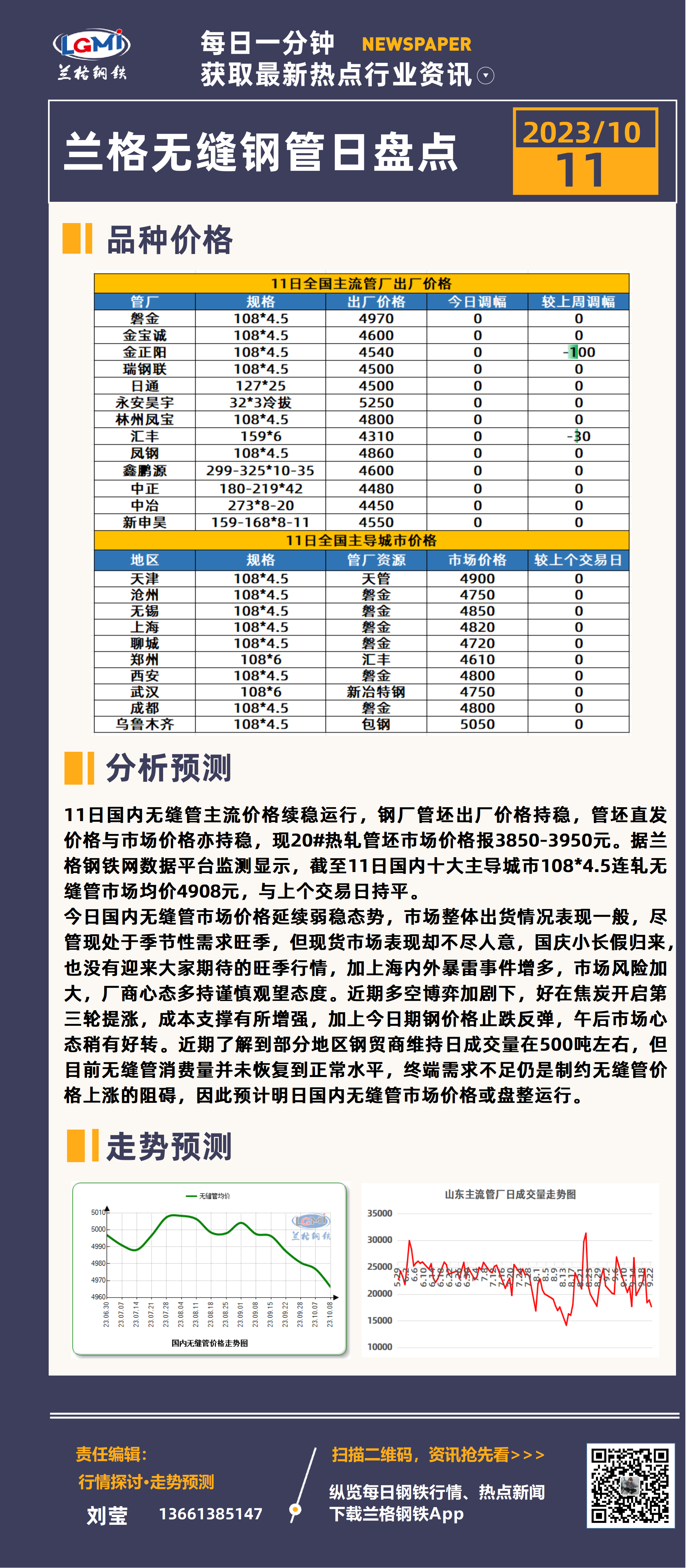 - 10月11日全国无缝管出厂价格汇总2023/10/11