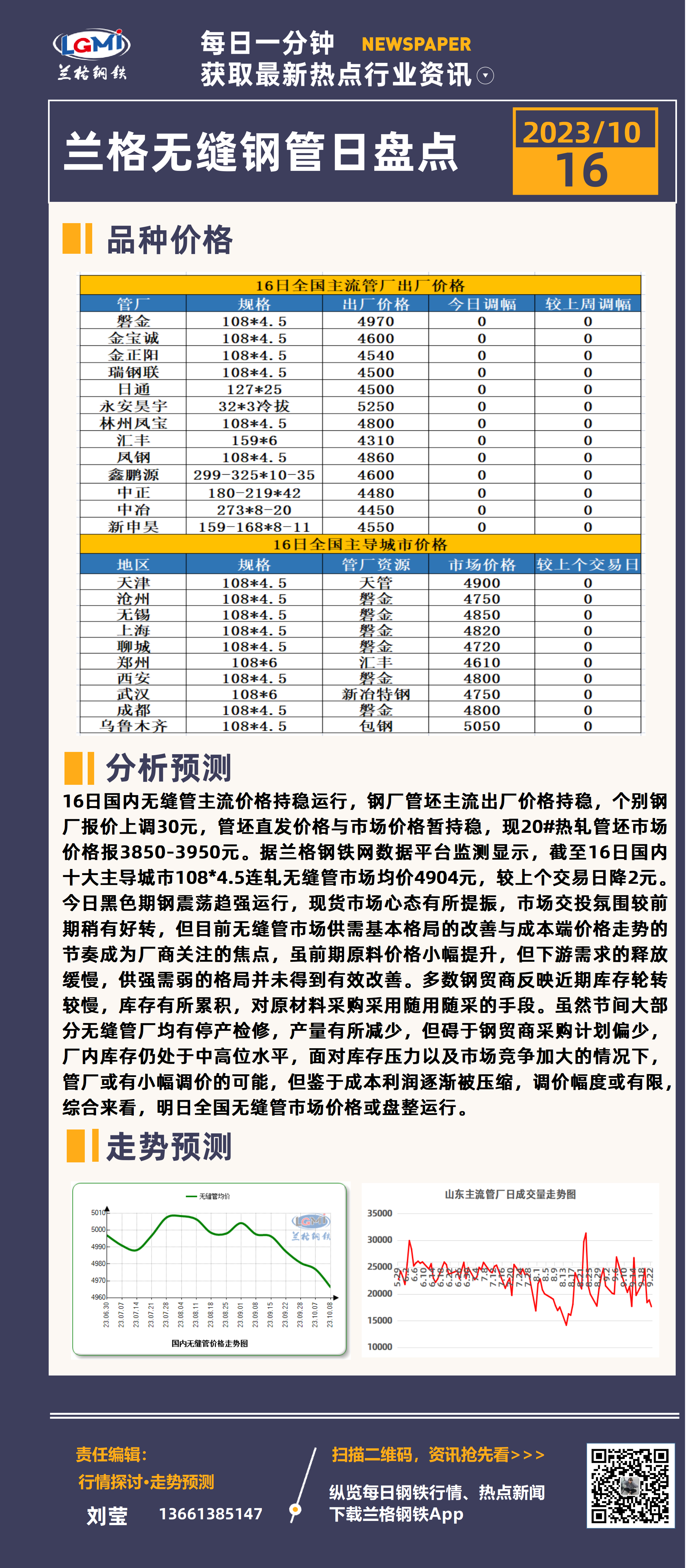- 兰格无缝管日盘点:受期钢提振信心 无缝管价格盘整运行2023/10/16