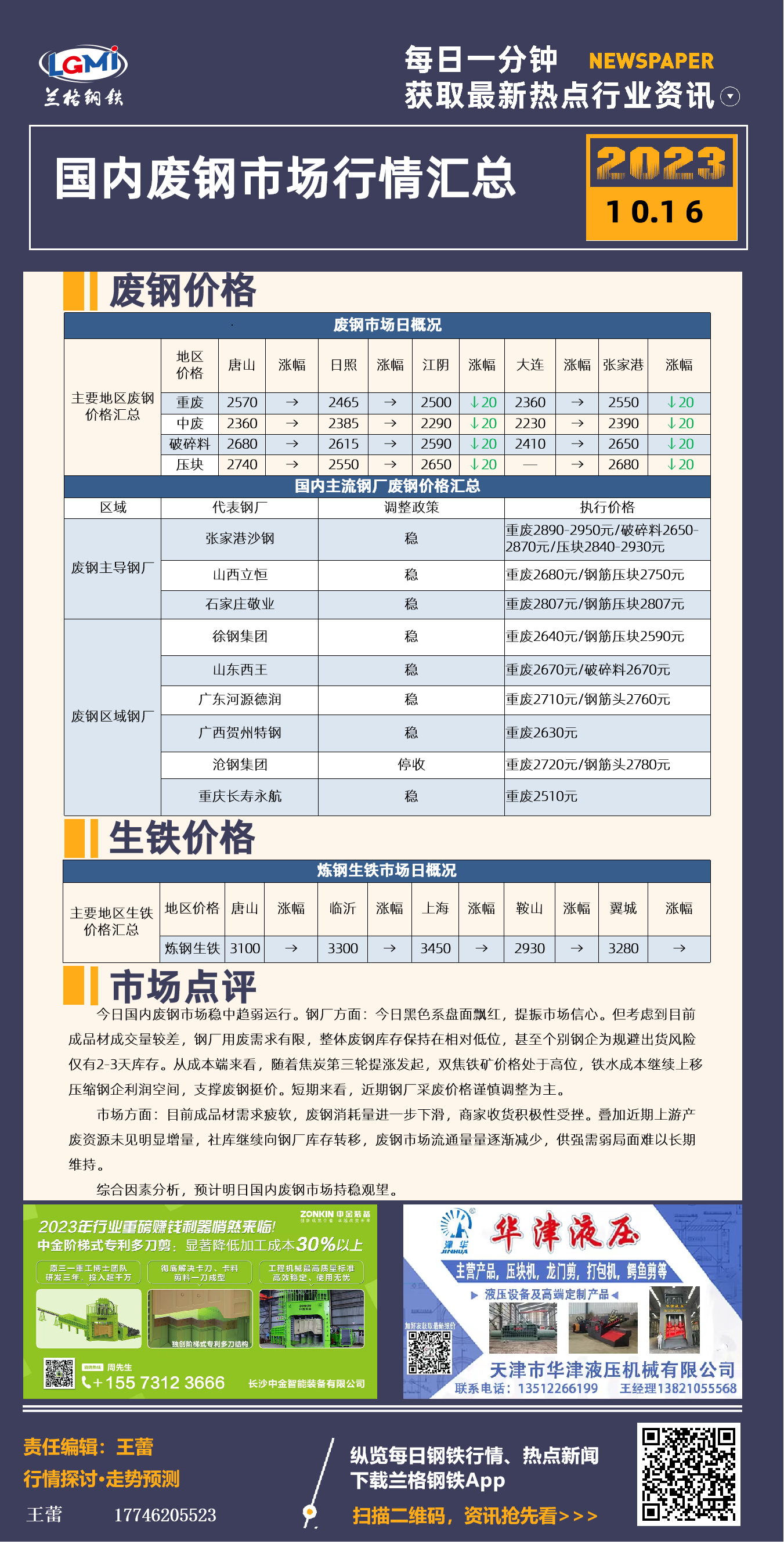 - 今日国内废钢市场稳中趋弱运行 明日持稳观望2023/10/16