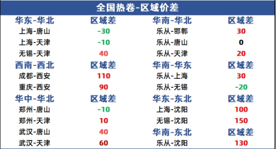 南北区域价差小幅收窄。上海-唐山价差-30元,上海-天津价差-10元,乐从-邯郸价差30,乐从-唐山价格持平。