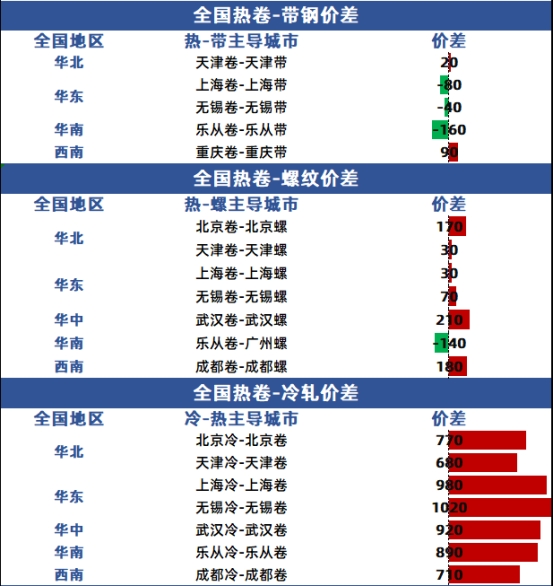 品种价差方面,热卷-带钢、热卷-螺纹以及冷卷-热卷价差均呈现窄幅波动。