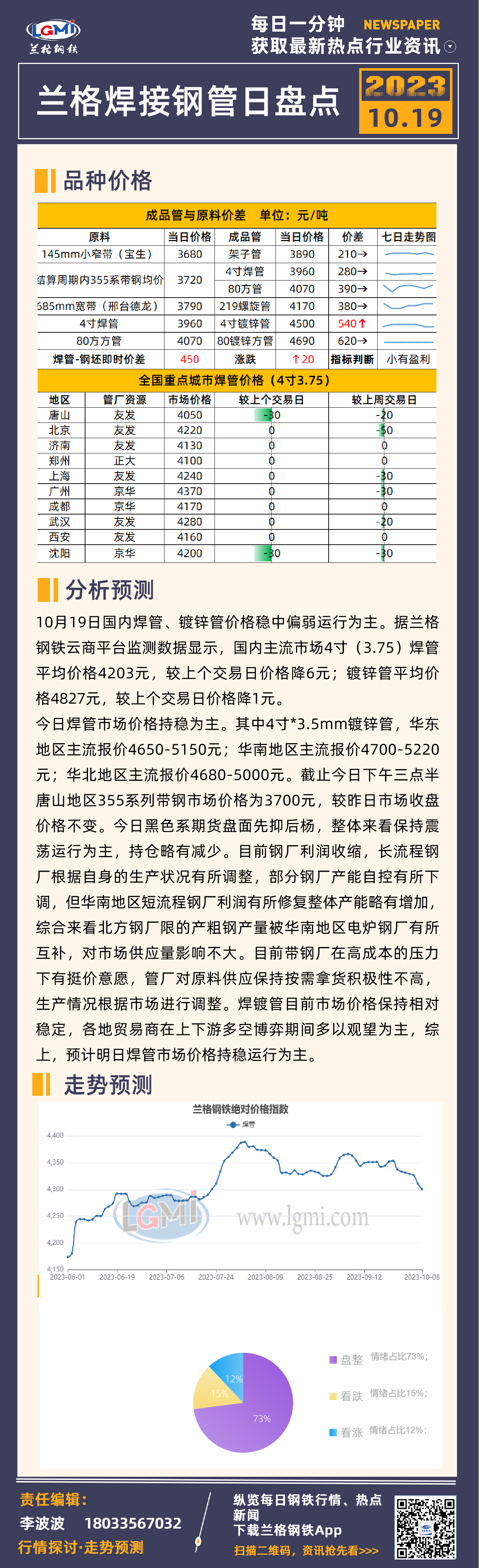 - 兰格焊管日盘点:价格持稳为主 刚需用量萎缩2023/10/19