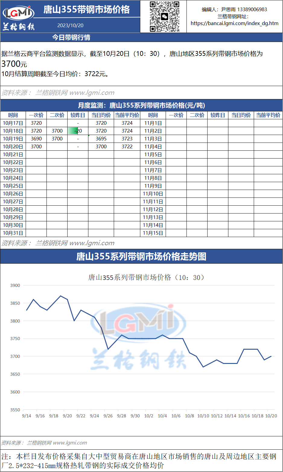 - 10月20日(10:30)唐山355系带钢市场价格2023/10/20