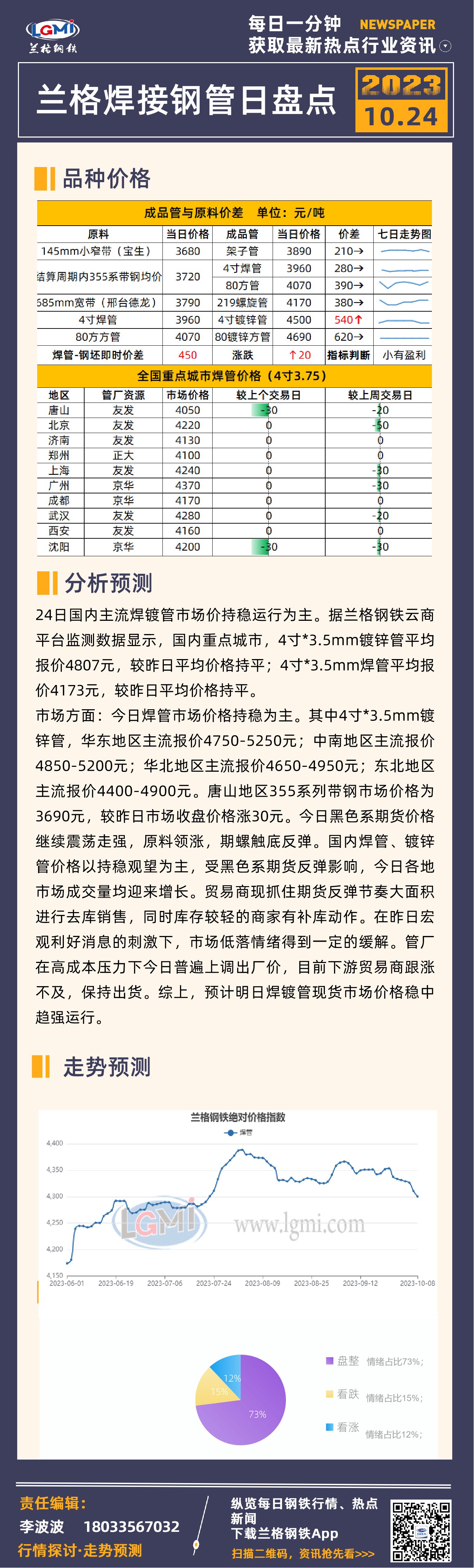 - 10月24日兰格津唐邯焊管、镀锌管早间速递2023/10/24