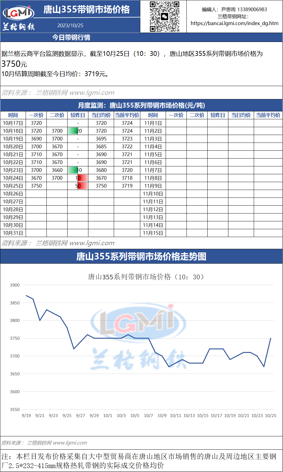 - 10月25日(10:30)唐山355系带钢市场价格2023/10/25