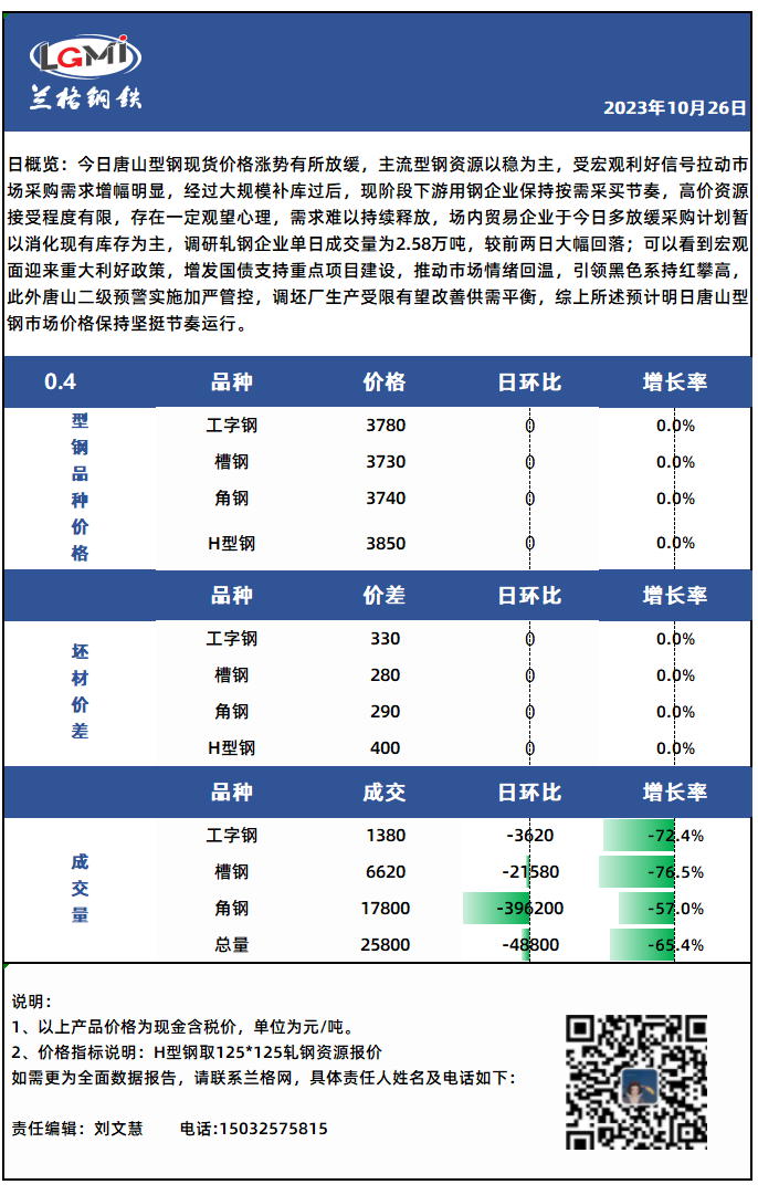 - 10月26日(9点)唐山型材厂H型钢实时调价汇总2023/10/26