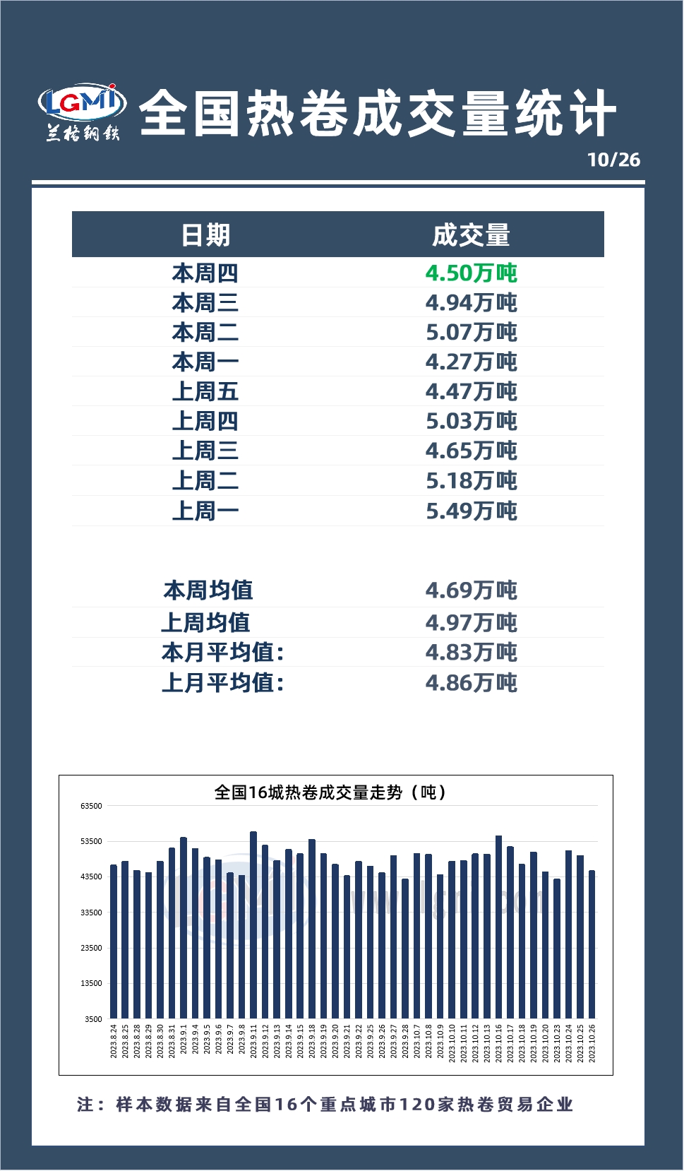 据兰格钢铁云商平台监测数据显示,10月26日全国16个重点城市热轧板卷大户日出货量约为45010吨,较昨天减少4340吨。其中北方区域唐山热轧板卷大户出货量约为3500吨,较昨日减少1690吨;南方区域杭州热轧板卷市场大户出货量约为3900吨,较昨日减少400吨。期货盘面反弹动力不足,热卷现货市场整体交投一般,今日热卷大户出货量继续下降。