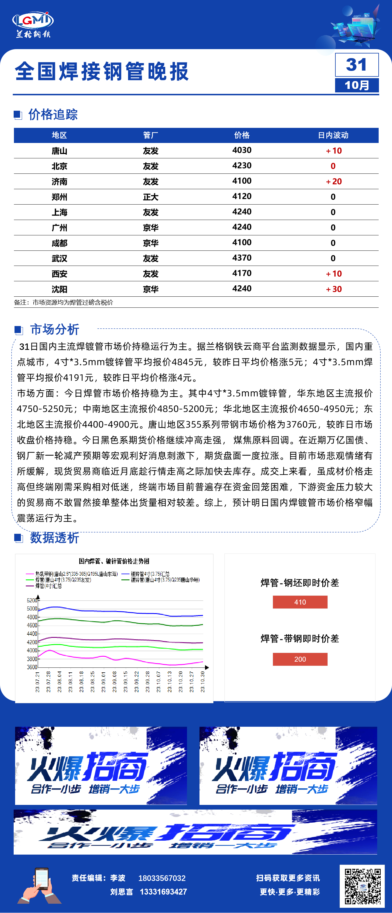 - 10月31日兰格津唐邯焊管、镀锌管早间速递2023/10/31