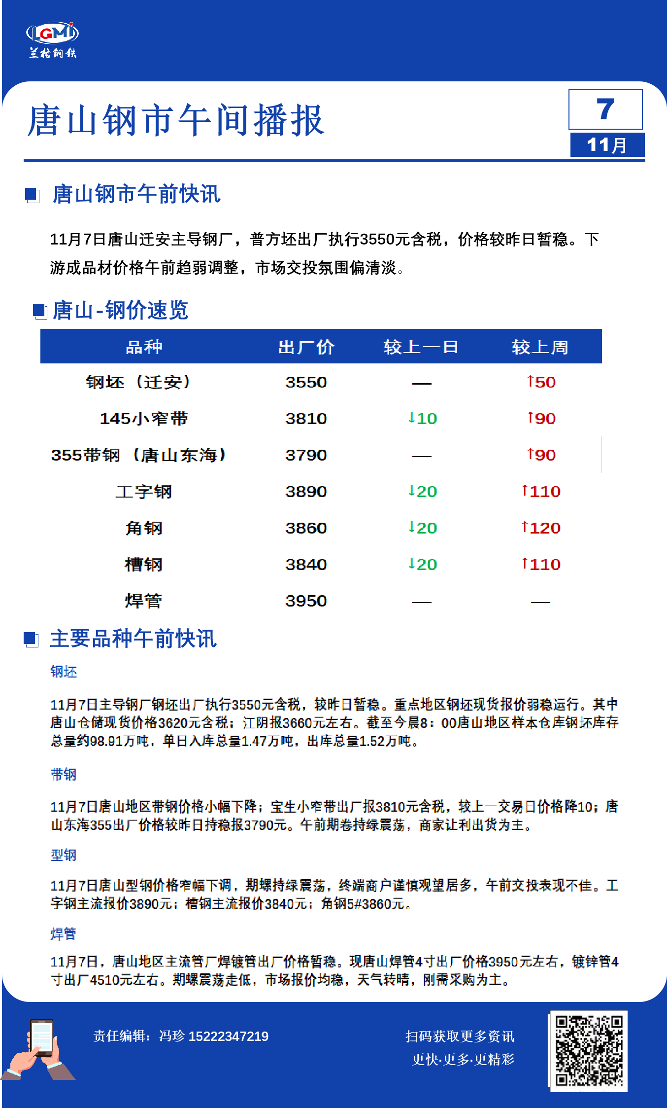 - 11月7日兰格唐山钢市午间播报2023/11/7