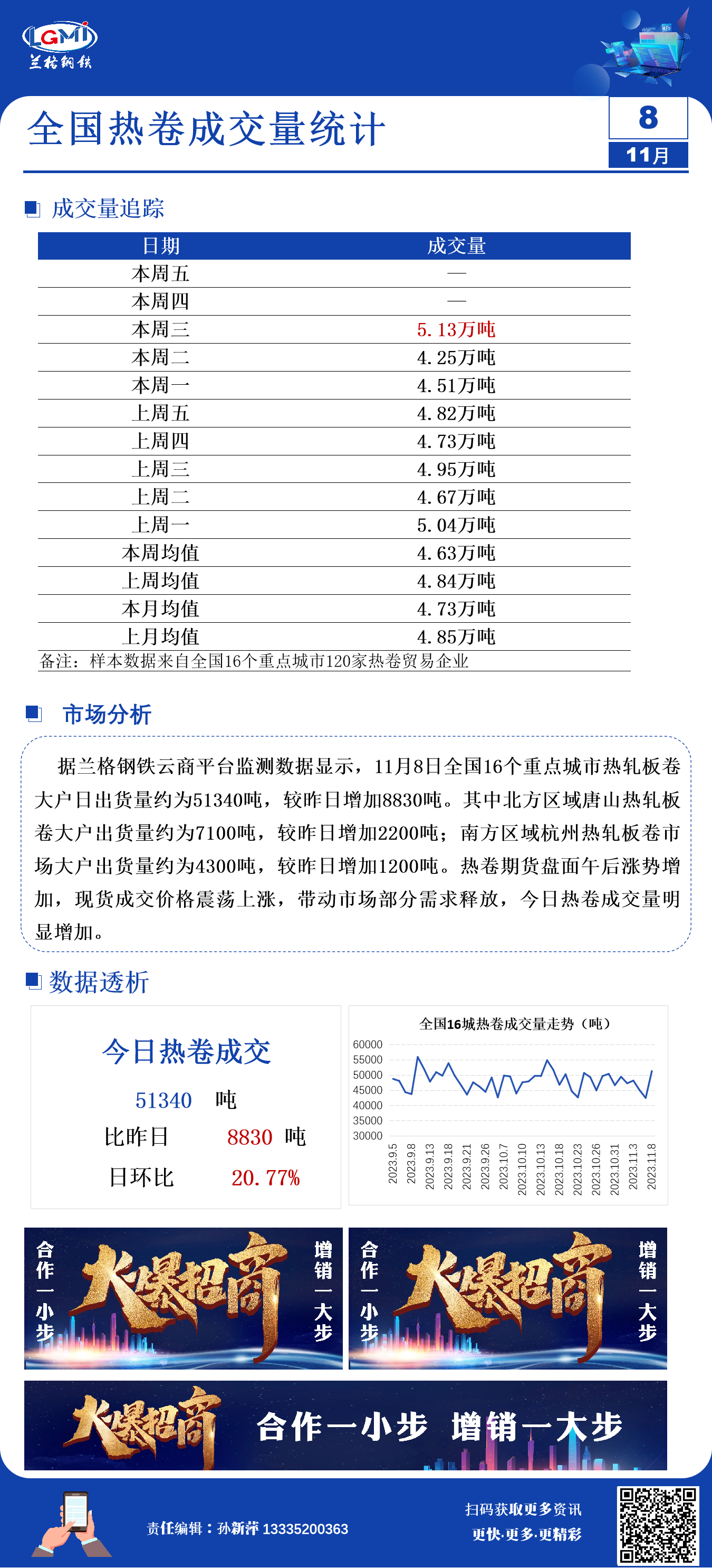 - 11月8日全国16个城市热轧板卷大户日成交量2023/11/8