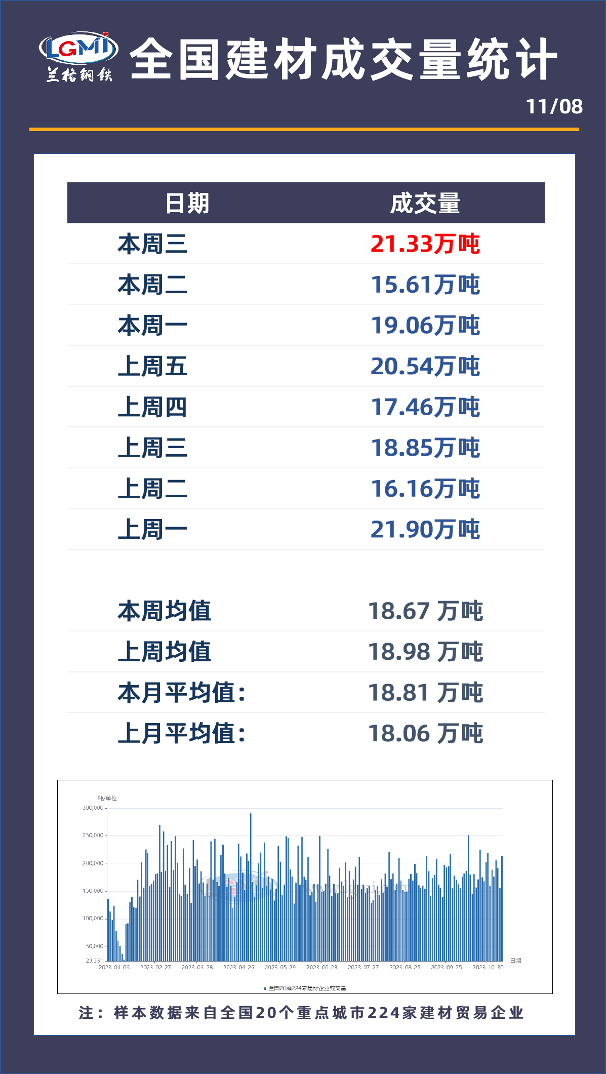 据兰格钢铁网调研数据显示,11月8日全国20个重点城市224家建筑钢材大户商家日出货量约为21.33万吨,较上个成交日增加5.72万吨,本周均值18.67万吨,比上周均值减少0.31万吨。