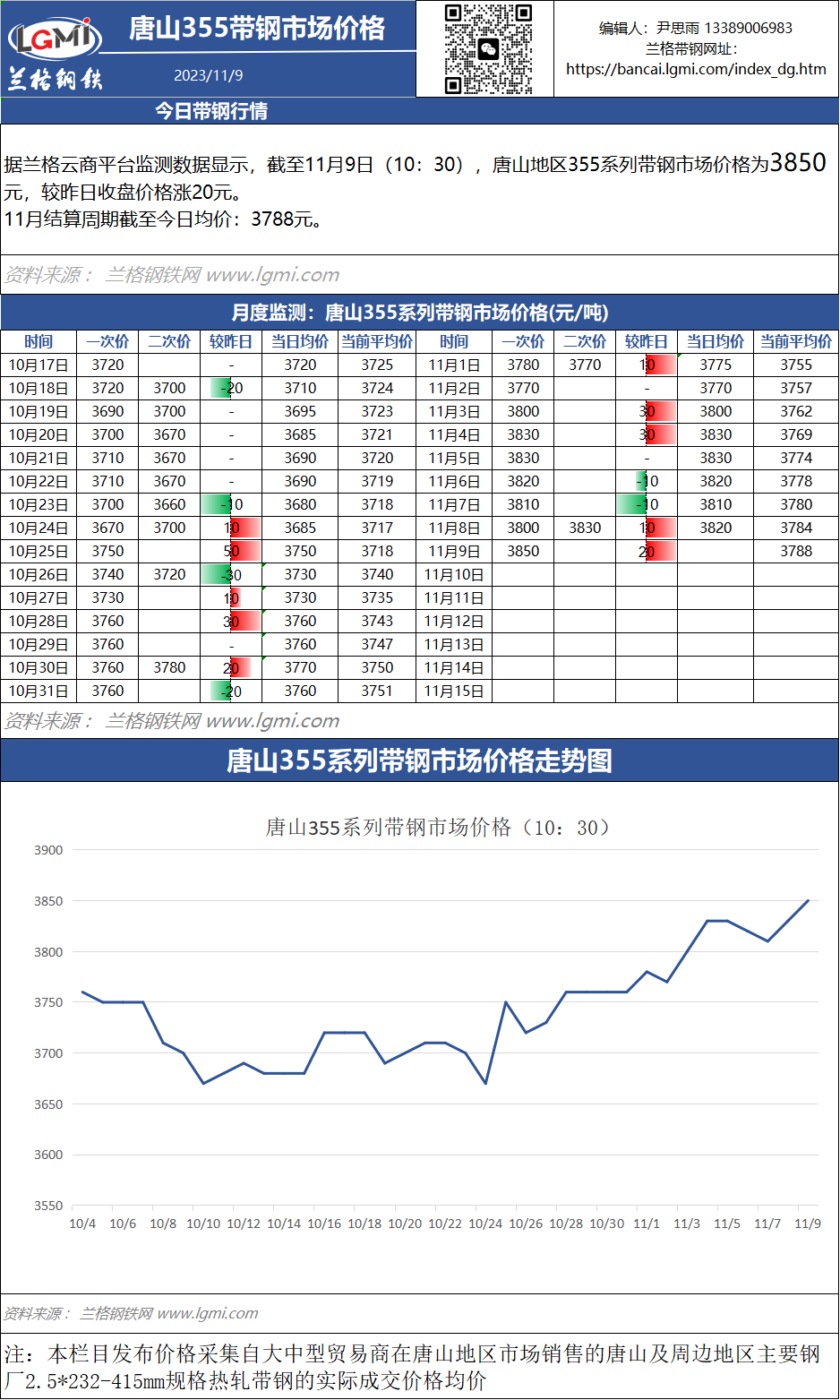 - 11月9日(10:30)唐山355系带钢市场价格2023/11/9