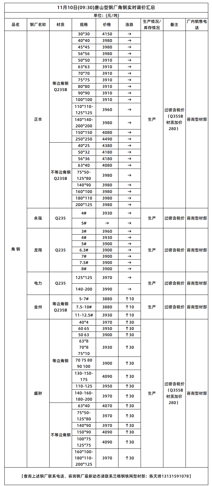 11月10日(09:30)唐山型钢厂角钢实时调价汇总