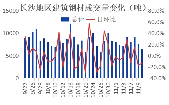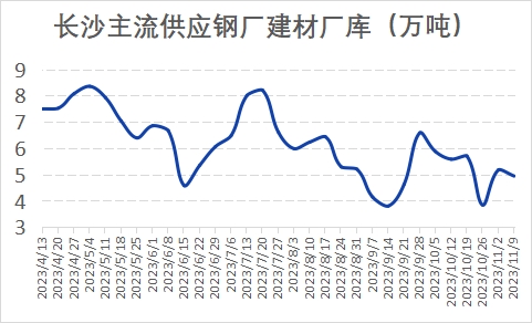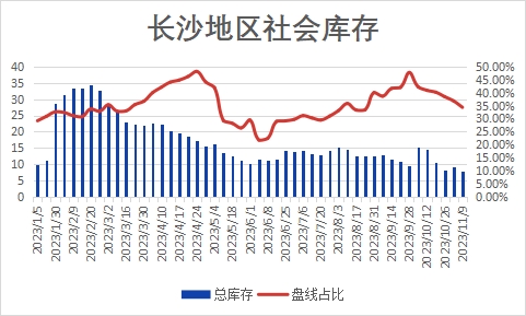 库存方面,本周长沙建材社会库存明显减少,为全年最低库存,截止11月9日,长沙建材社会库存为7.89万吨,较上周同期减少1.43万吨,其中螺纹钢5.18万吨,盘线2.71万吨。