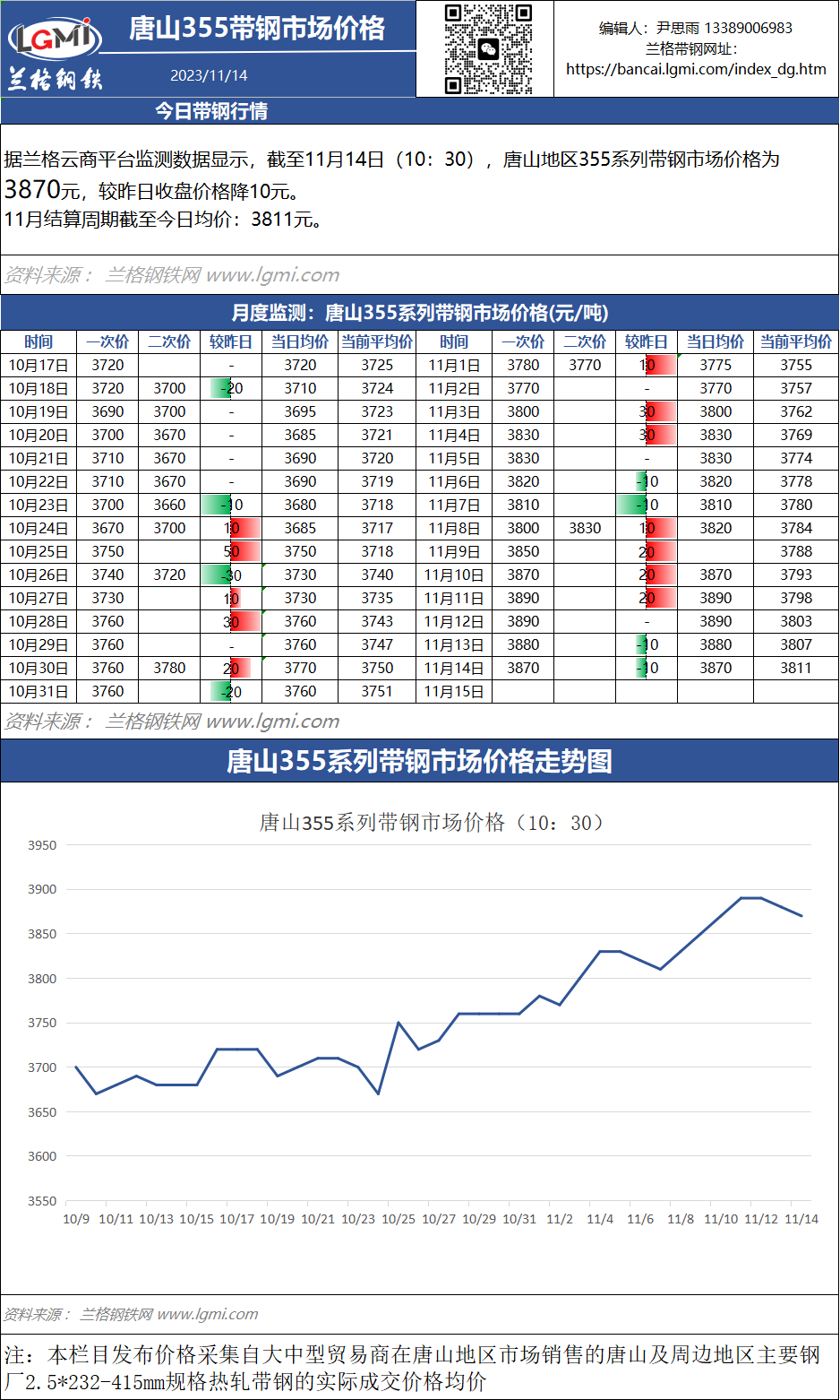 - 11月14日(10:30)唐山355系带钢市场价格2023/11/14