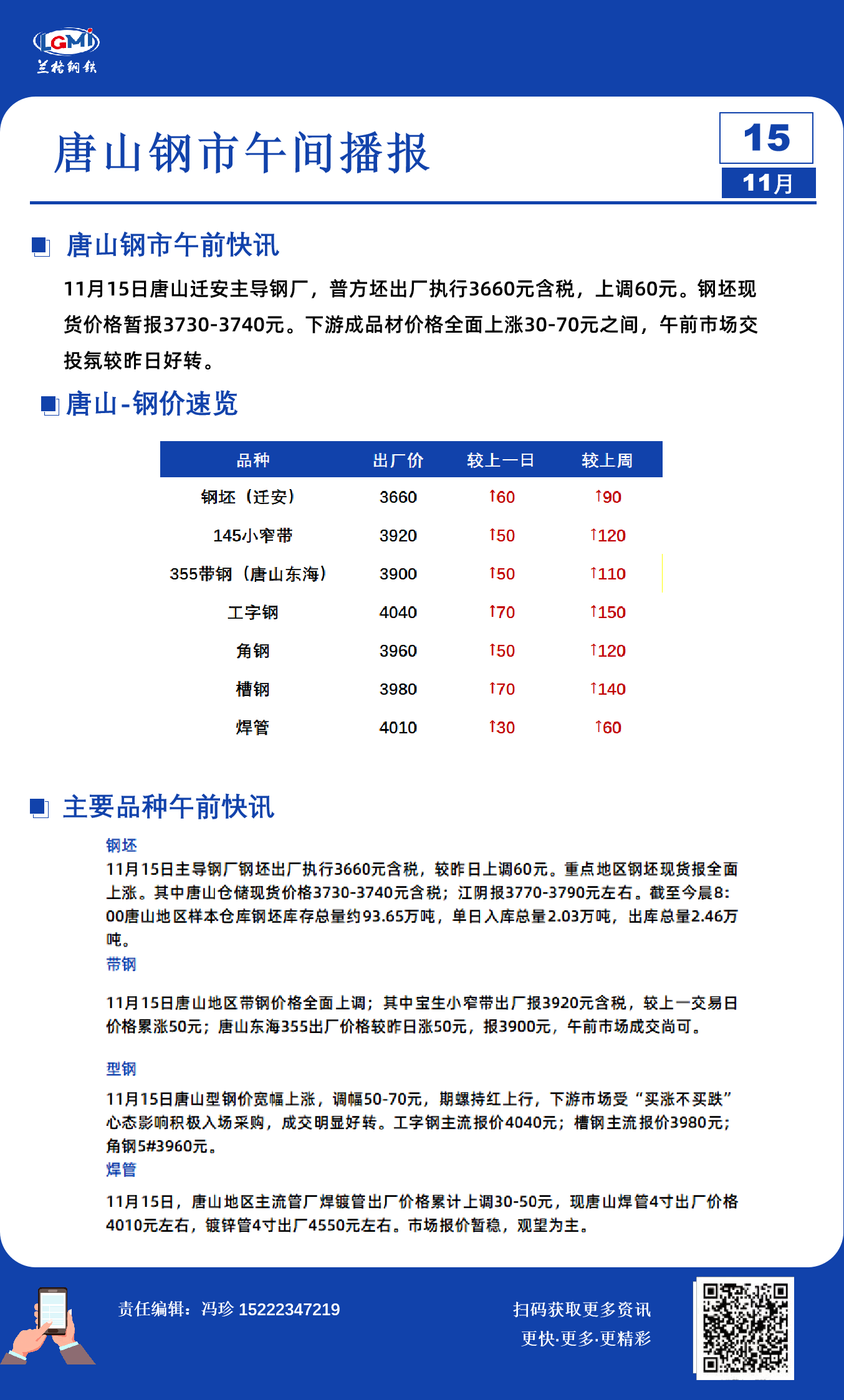 - 11月15日兰格唐山钢市午间播报2023/11/15