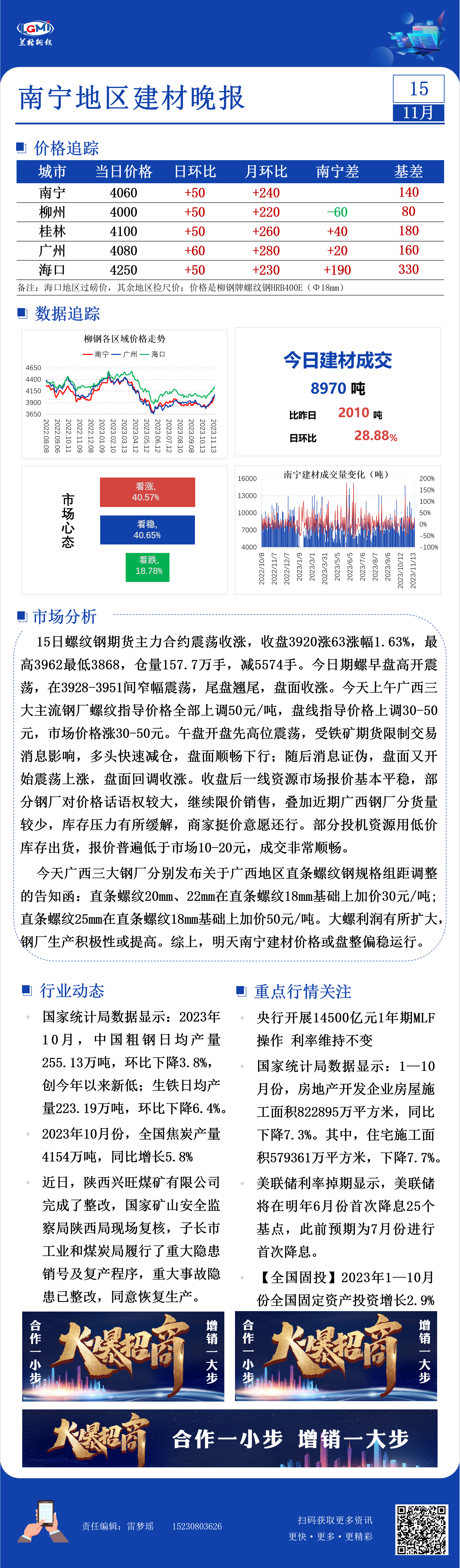 - 11月15日广西贵港钢铁建材(桂宝)广西出厂价格上调50元/吨2023/11/15