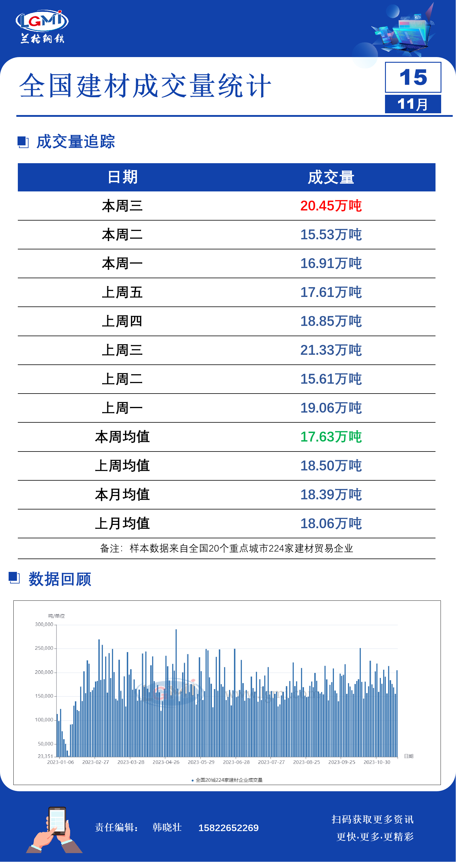 - 11月15日全国建材成交量大幅增加2023/11/15