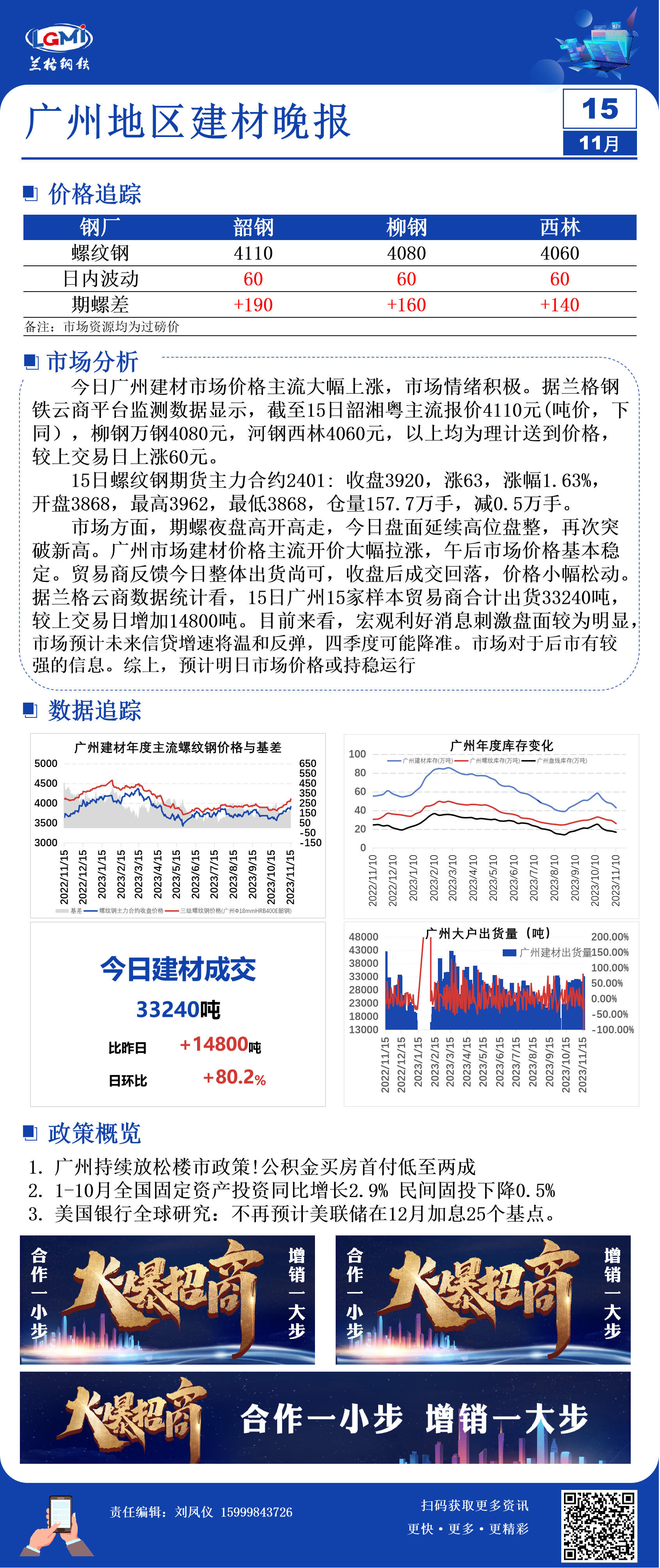 - 11月15日全国建材成交量大幅增加2023/11/15