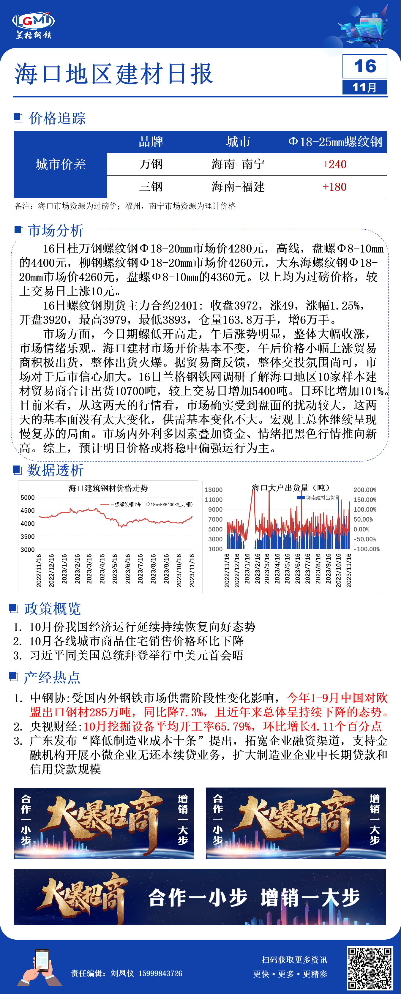 - 综述:16日国内建材价格小幅上涨2023/11/16