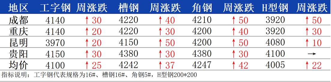 云贵型钢市场:本周云贵型钢市场涨幅扩大,随着成本端不断推高,现货被动跟涨,成交略显不均,市场大户和资源充足商家出货尚可,其它表现一般。单从价格来看,上半周云贵价格整体趋稳,下半周宏观利好扎堆释放,成本轮番涨价推动下,市场价格开始探涨。供应方面:工字钢因为守着昆钢和玉昆两大钢厂,及当地调坯钢厂,资源充足,代理商有一定压力,现货涨幅不及成本端,市场操作比较谨慎,并不盲目上调。