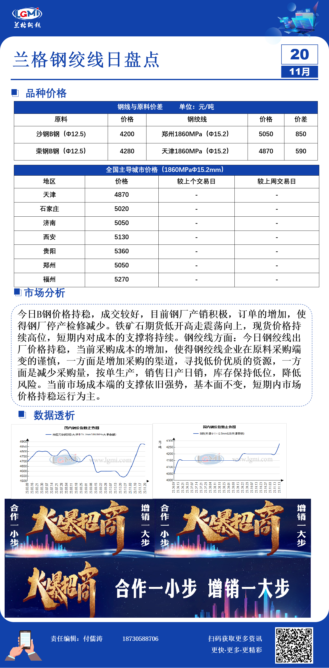 - 兰格钢绞线日盘点:钢绞线企业出厂价格持稳,成交好转2023/11/20