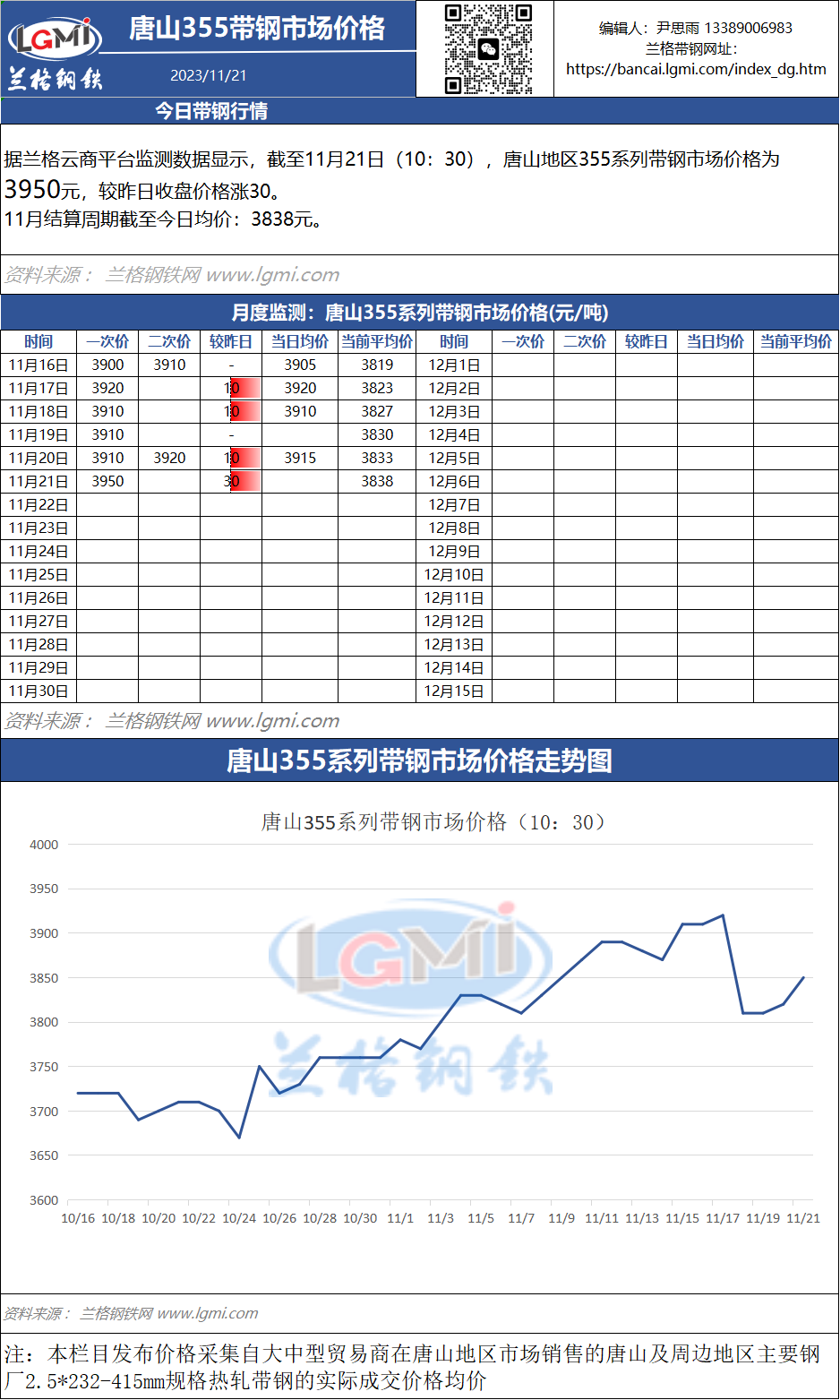 - 11月21日(10:30)唐山355系带钢市场价格2023/11/21