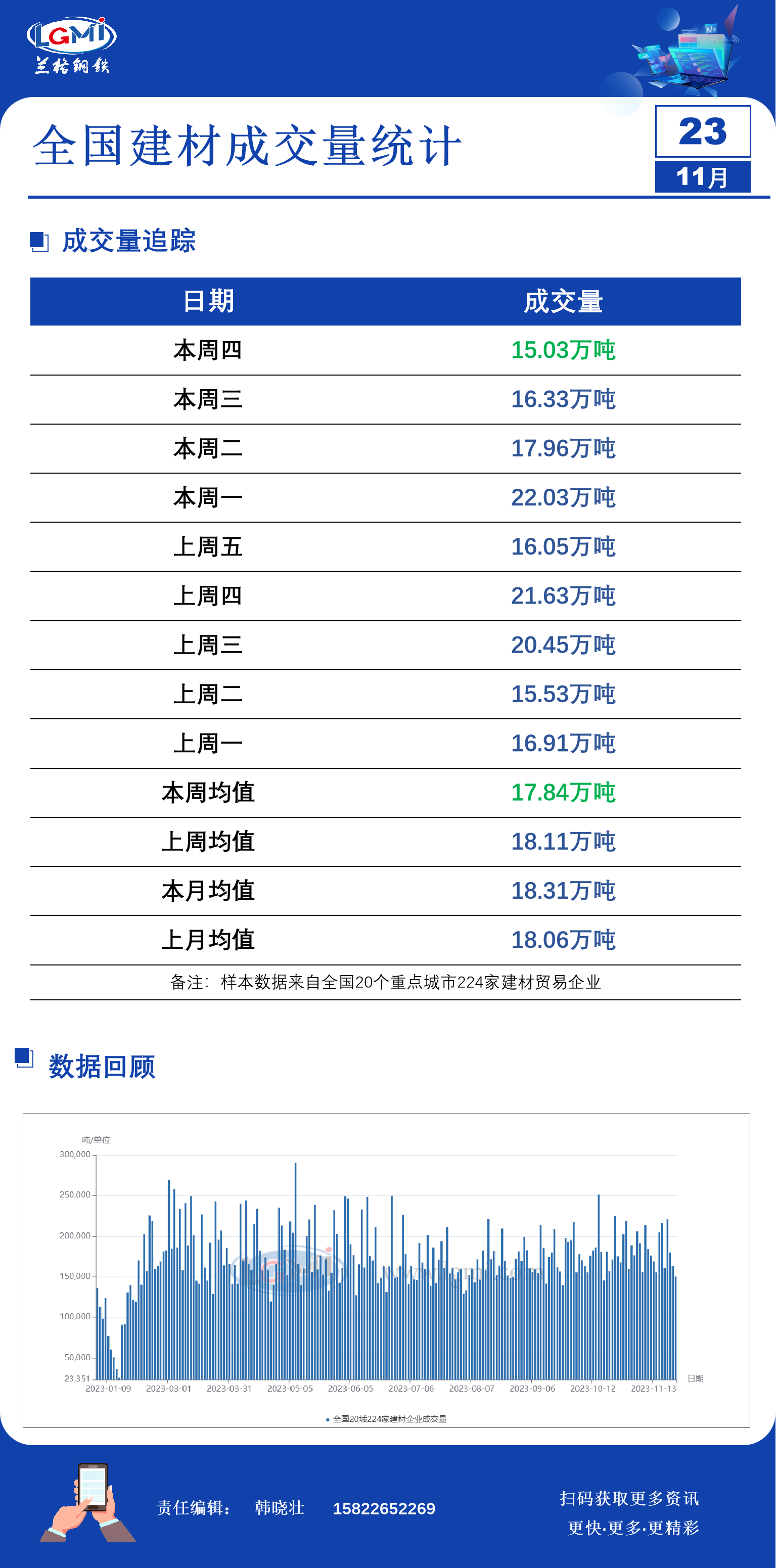 本据兰格钢铁网调研数据显示,11月23日全国20个重点城市224家建筑钢材大户商家日出货量约为15.03万吨,较上个成交日减少1.30万吨,本周均值17.84万吨,比上周均值减少0.27万吨。