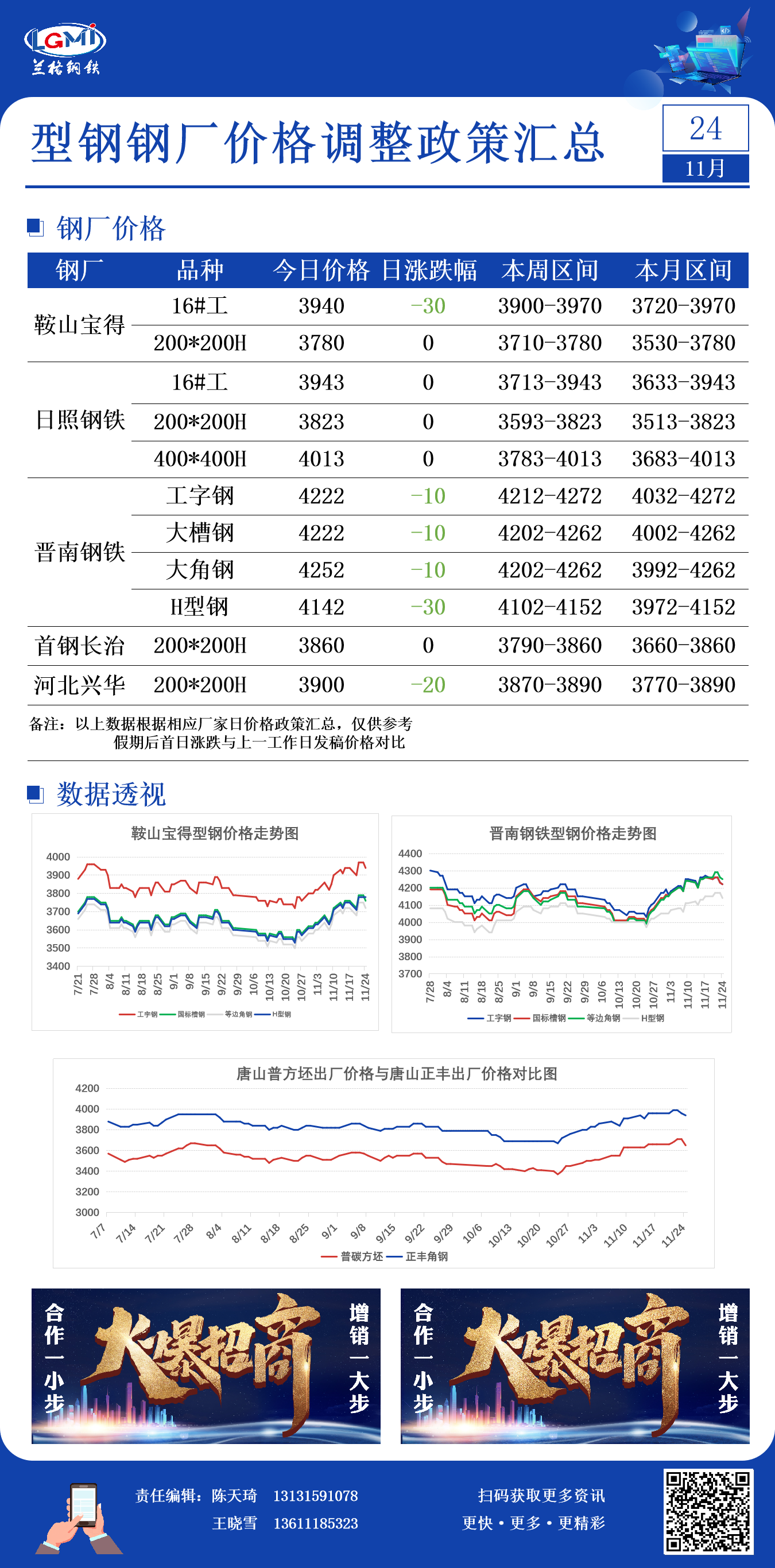 - 11月24日型钢钢厂价格调整政策汇总2023/11/24