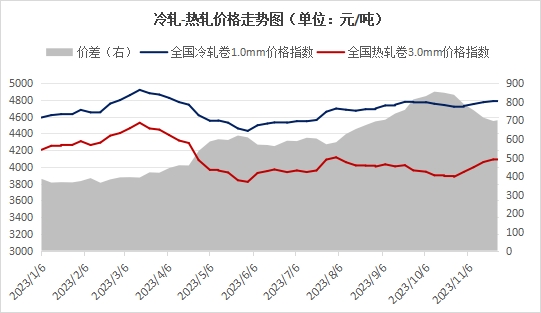 上图显示,2023年冷热价差呈逐渐扩大之势,十一月份有所收缩。分析其中原因:一方面冷轧的供应端前期受利润的影响产量有所下降,加之后期冷轧的下游消费有所回升,造成了市场冷轧出现了供弱需强,供需错配,价格表现相对坚挺。另一方面热卷由于前期利润和消费较好,供应端一直高位维持,后期消费又所有下降,造成热卷现在供强需弱的状态,价格出现较大幅度的下调。冷轧和热轧基本面走势出现分化,导致冷热价差逐渐走扩。