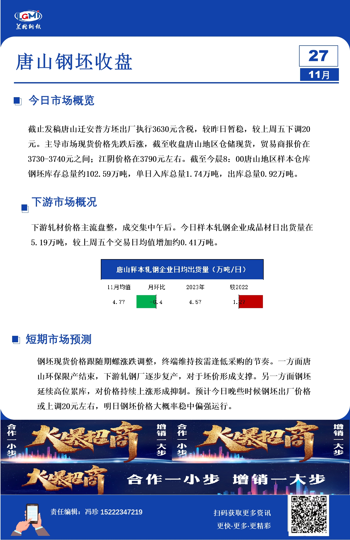 - 唐山钢坯收盘:预计明日价格稳中趋强运行2023/11/27