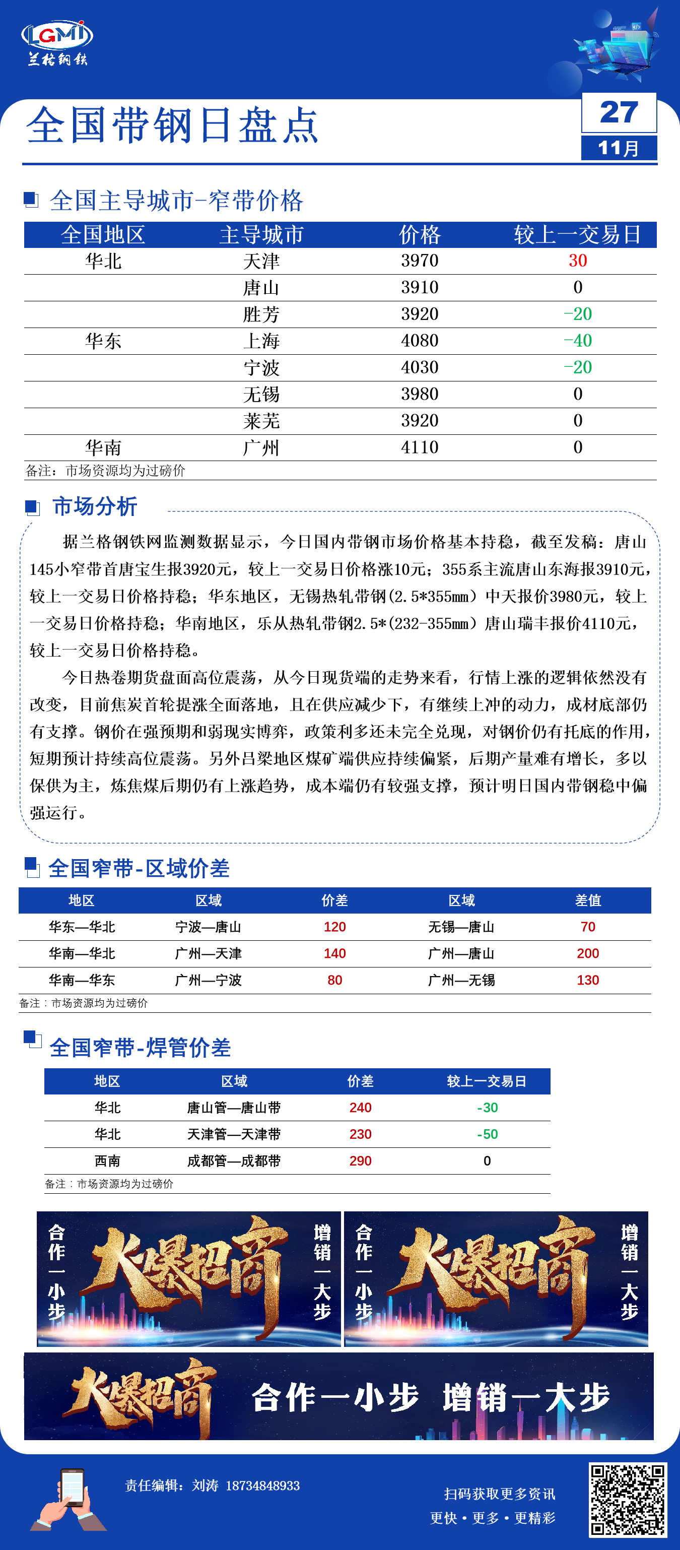 - 兰格带钢日盘点:带钢价格基本持稳 底部任有支撑2023/11/27