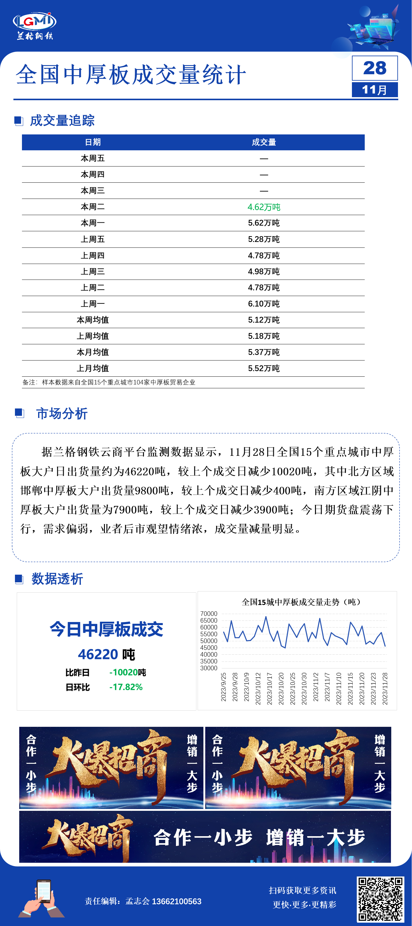 - 11月28日全国15个重点城市中厚板大户日成交量2023/11/28