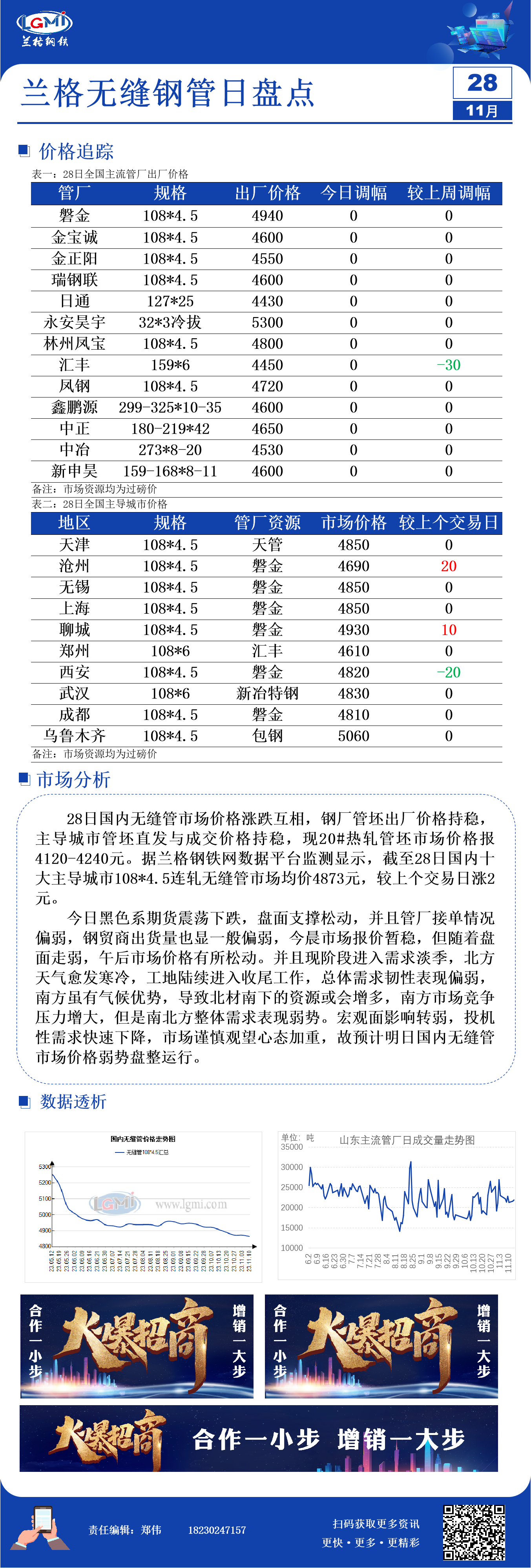- 兰格无缝管日盘点:无缝管市场价格涨跌互现 市场谨慎观望心态占主导2023/11/28