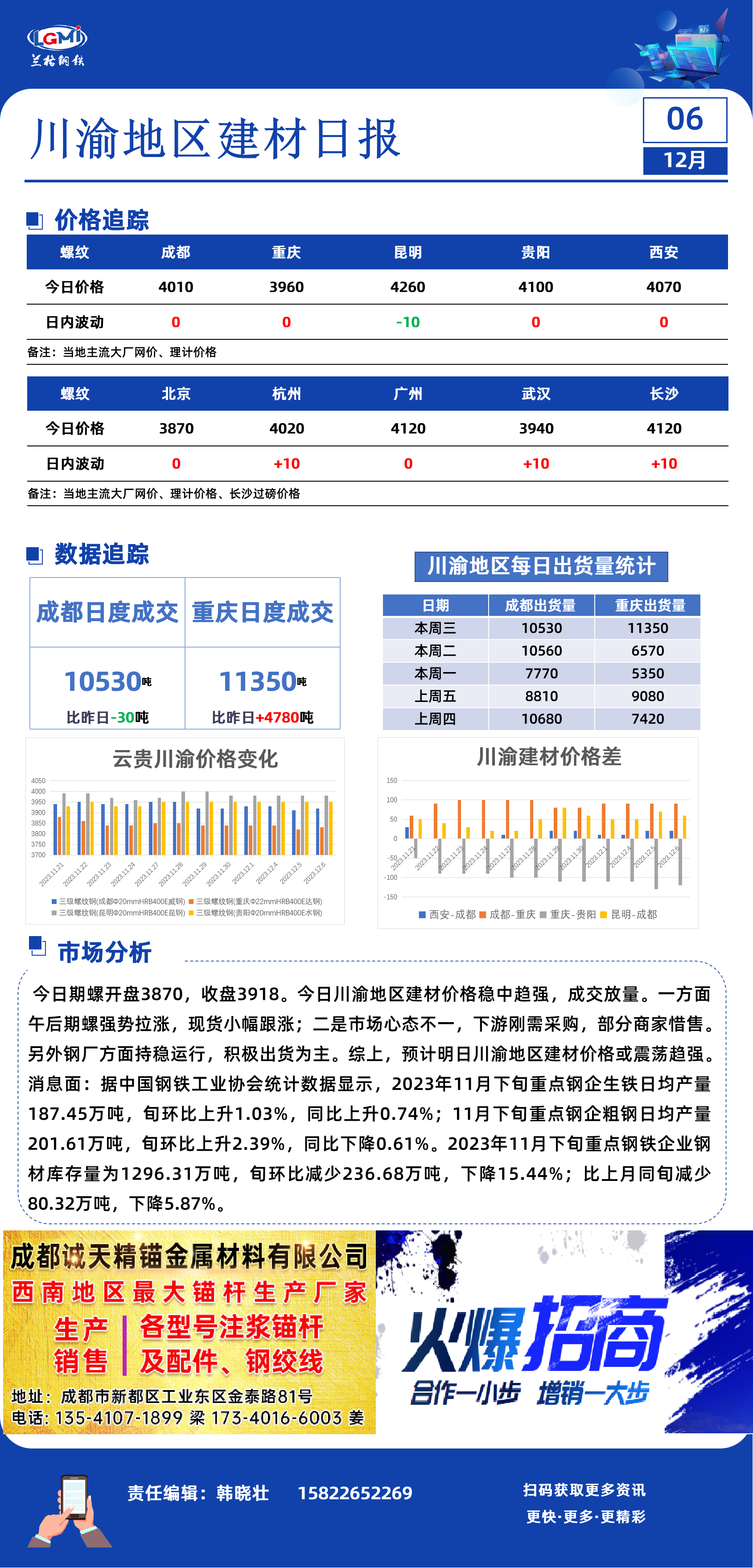 - 川渝地区建材价格稳中趋强 成交放量2023/12/6