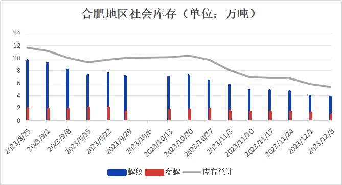 库存方面,本周合肥建材社会库存继续小幅减少,截止12月8日,合肥建材社会库存为5.35万吨,较上周减少0.44万吨,其中螺纹钢3.82万吨,盘线0.94万吨。钢厂利润尚可,供应持续高位,厂库和社库库存保持低位,供需压力不大。