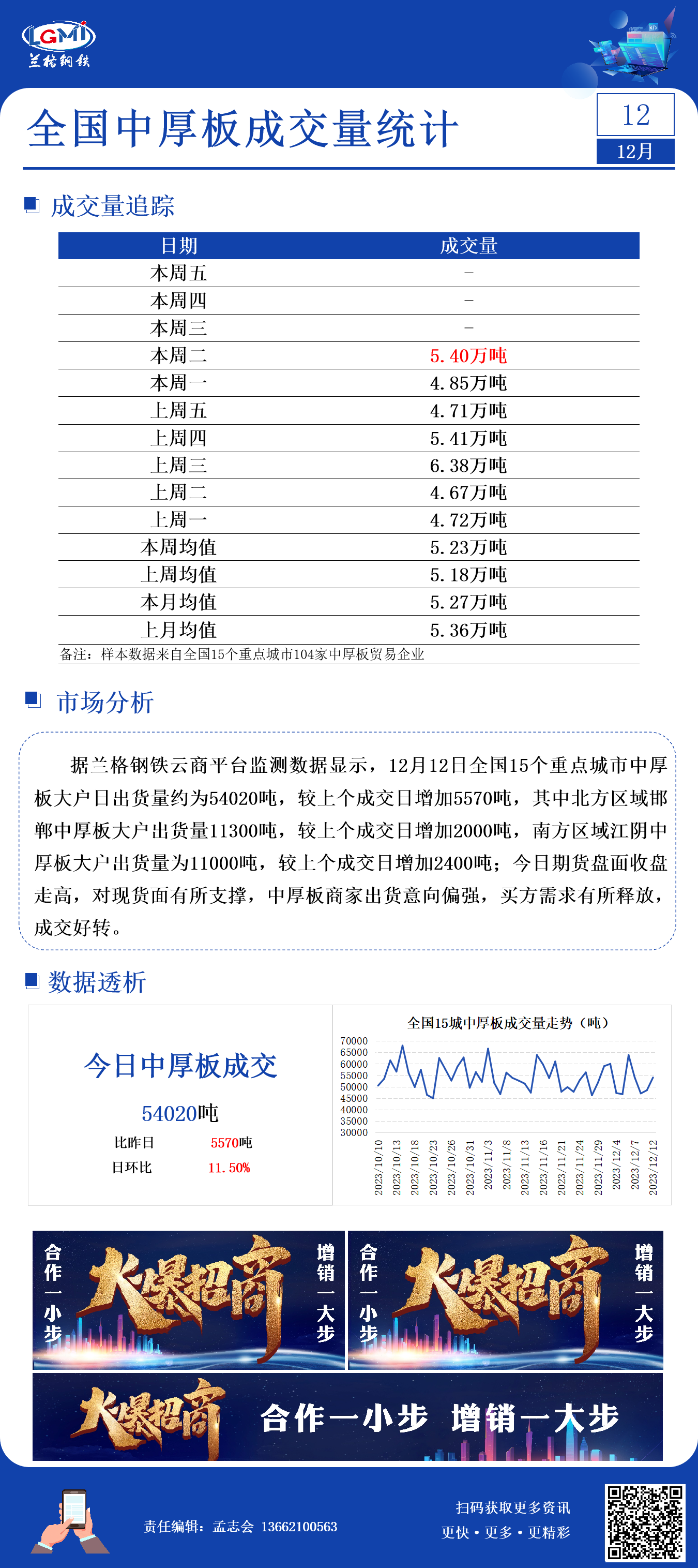 - 12月12日全国15个重点城市中厚板大户日成交量2023/12/12