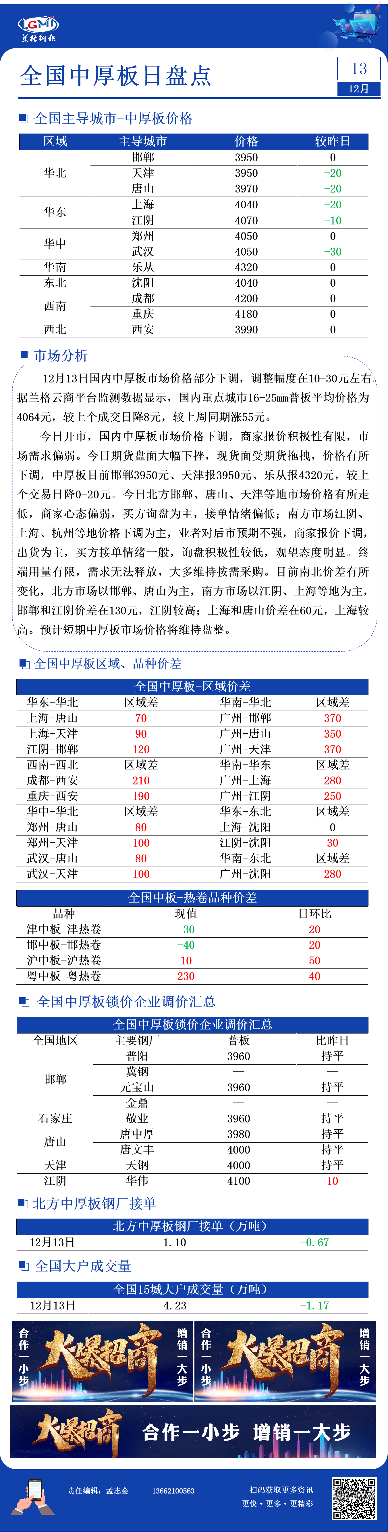 - 兰格中厚板日盘点:市场价格下调 成交整体偏弱2023/12/13