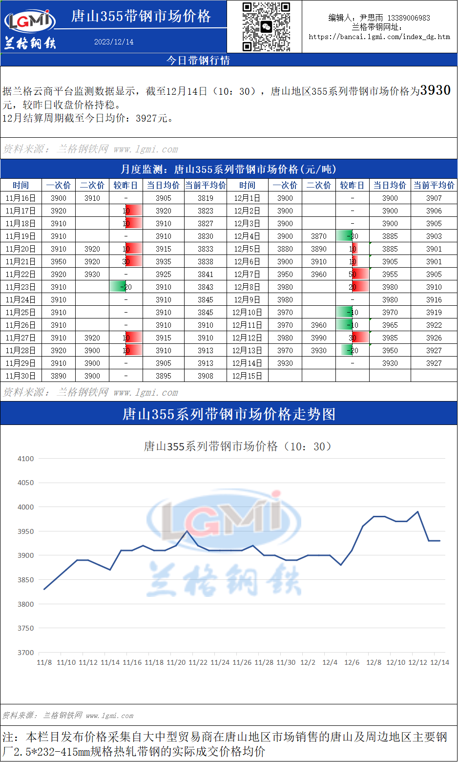 - 12月14日(10:30)唐山355系带钢市场价格2023/12/14