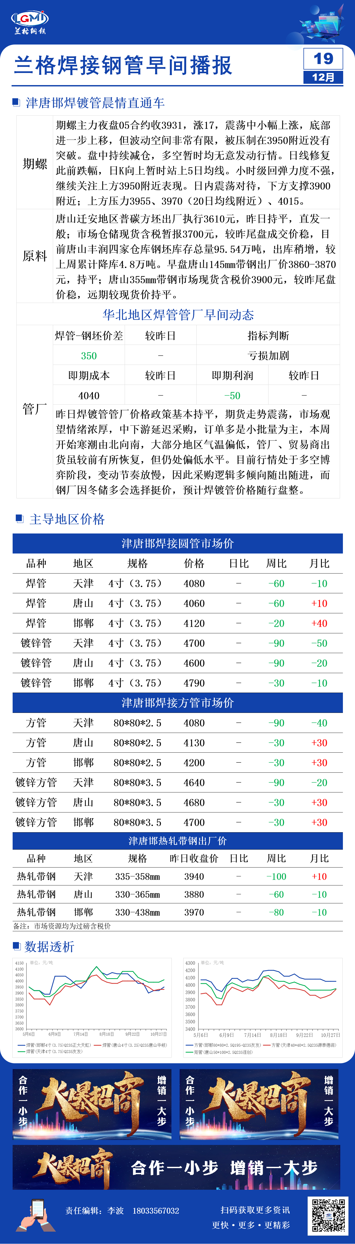 12月19日兰格津唐邯焊管、镀锌管早间预警
