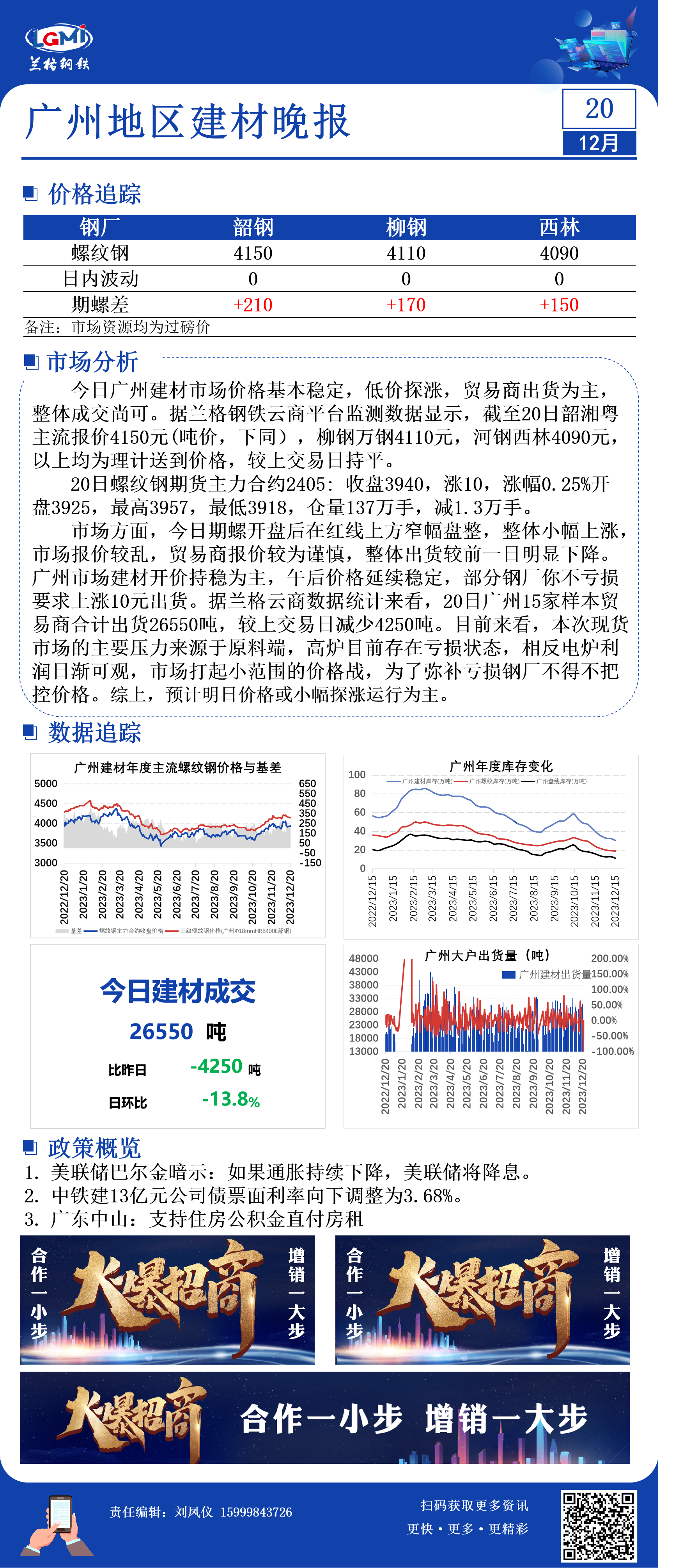 - 12月20日全国建材成交量小幅减少2023/12/20