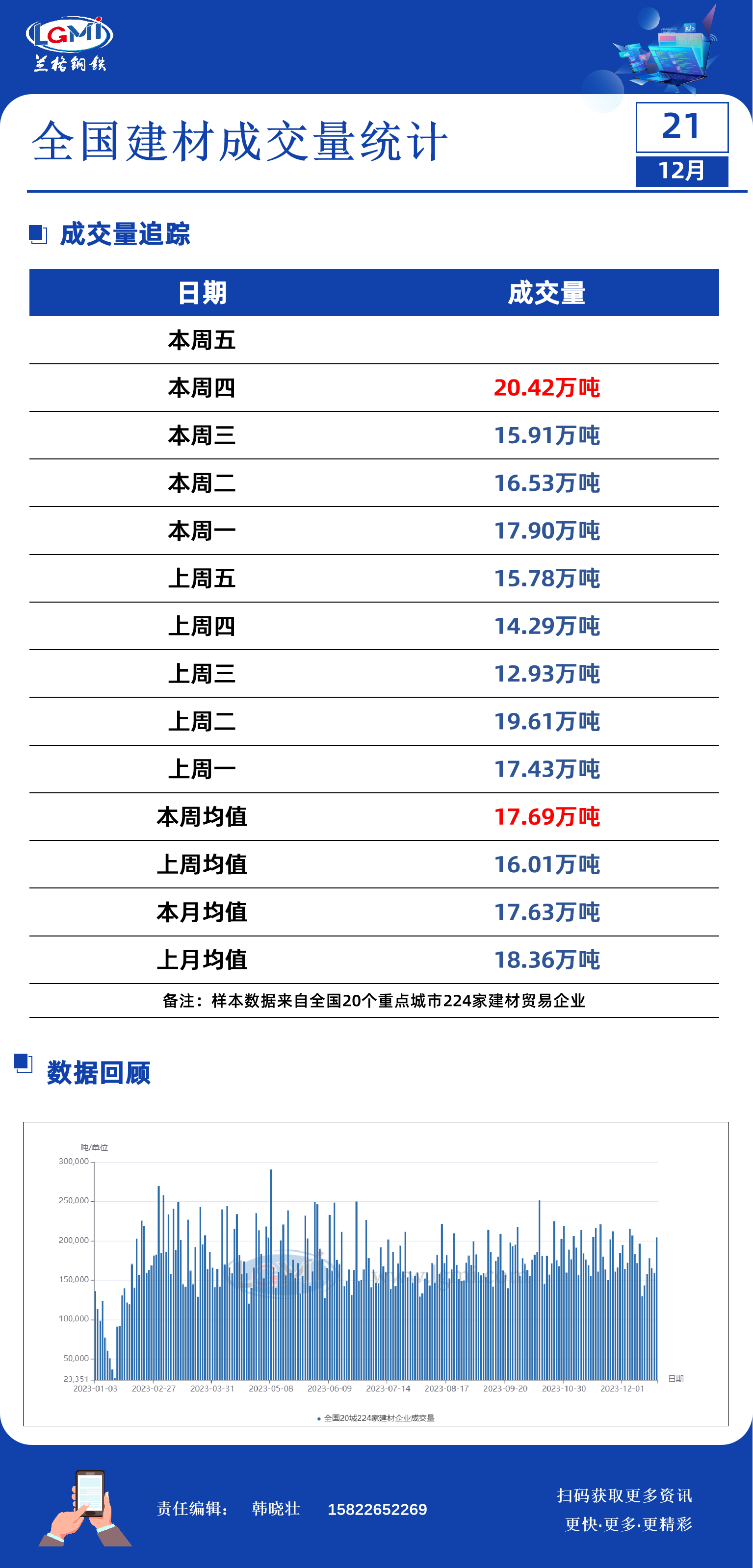 - 12月21日全国建材成交量大幅增加2023/12/21