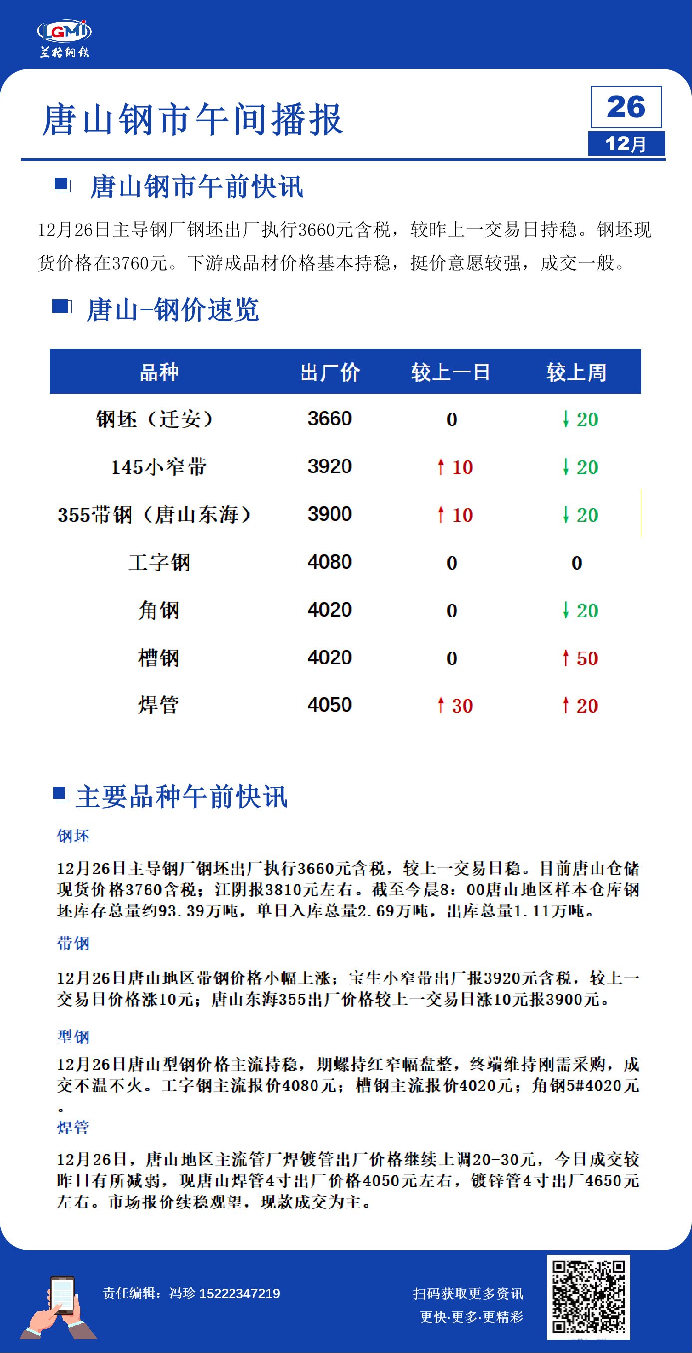 - 12月26日兰格唐山钢市午间播报2023/12/26