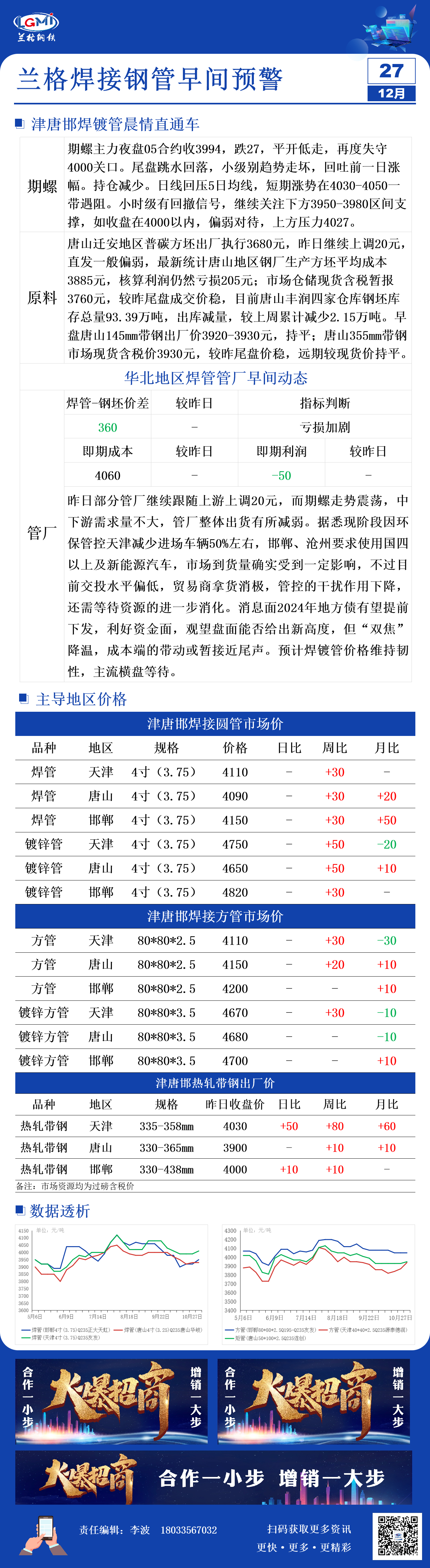 12月27日兰格津唐邯焊管、镀锌管早间预警