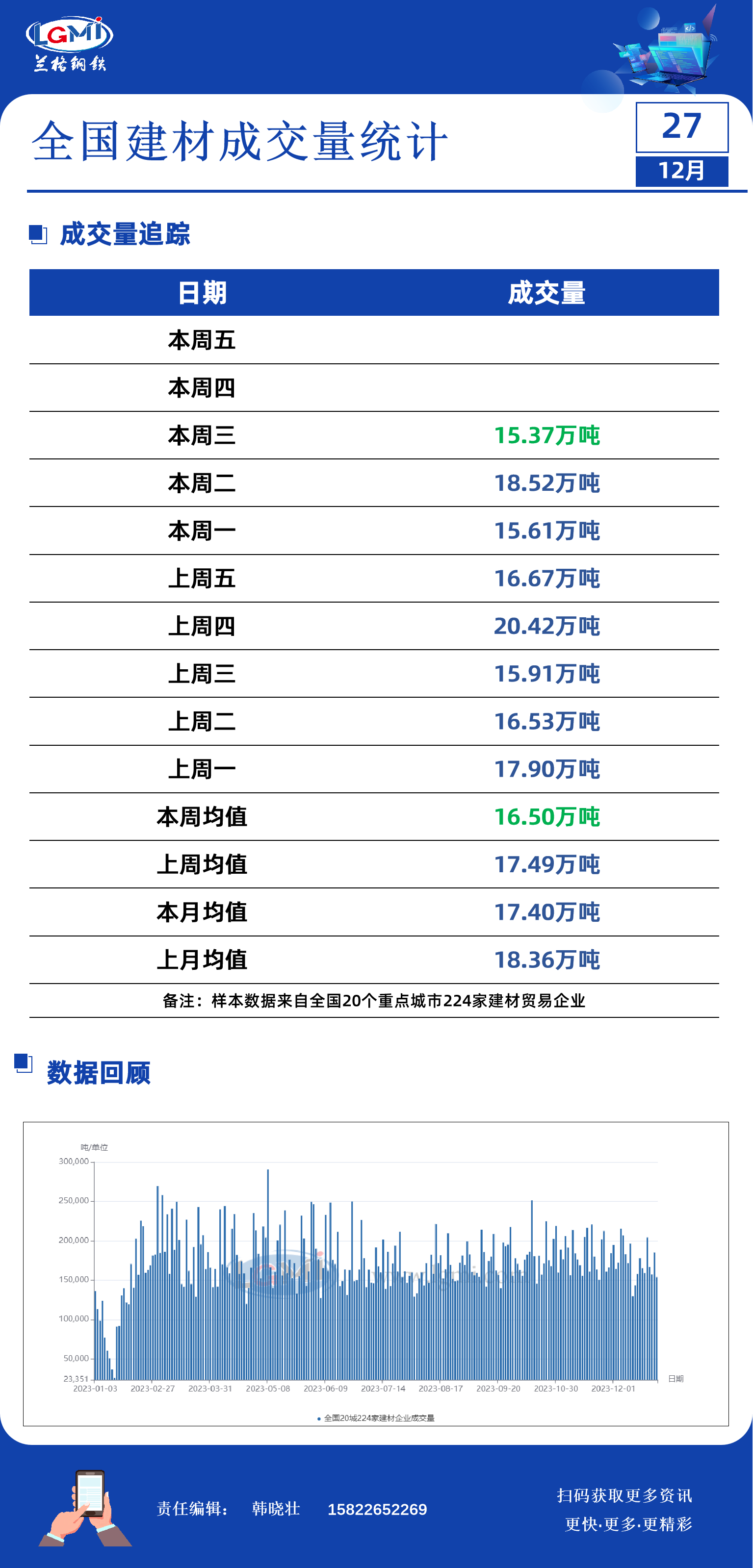 - 12月27日全国建材成交量小幅减少2023/12/27