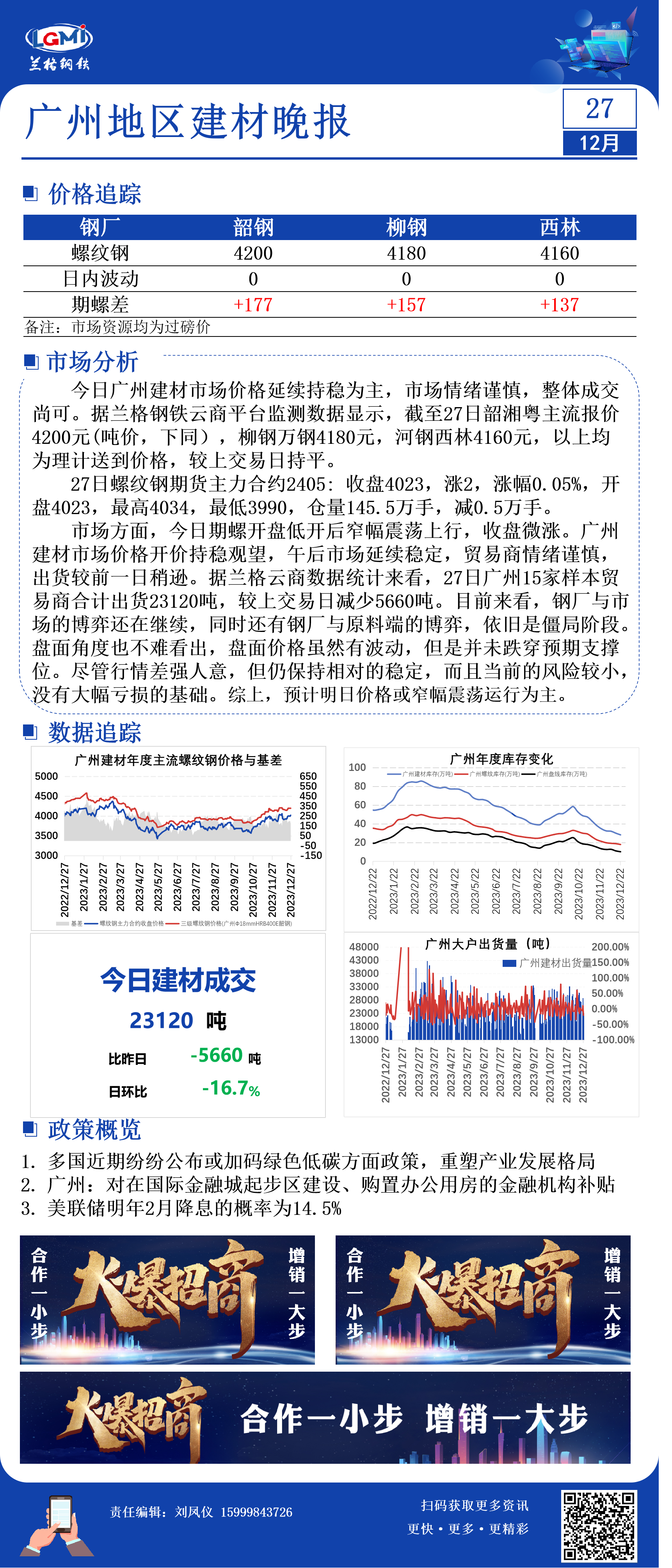 - 广州建材价格基本稳定 市场成交量明显回落2023/12/27