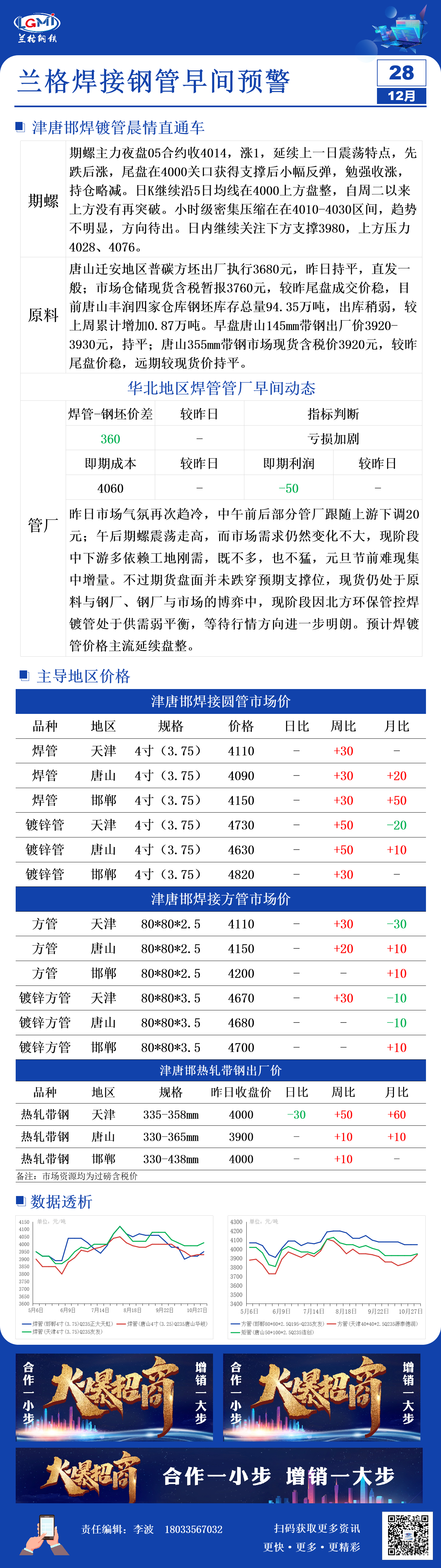 12月28日兰格津唐邯焊管、镀锌管早间预警