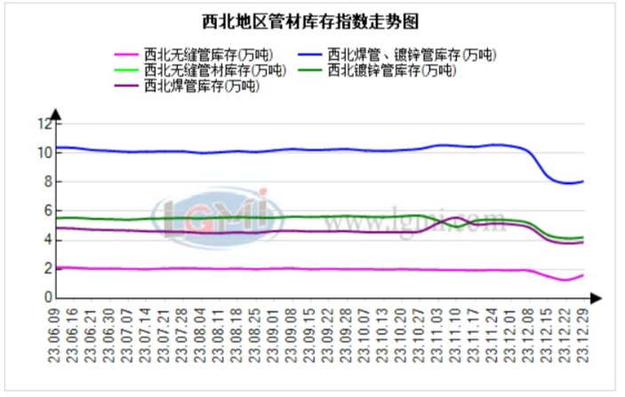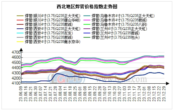 2023年12月份,西北地区管材市场价格震荡偏强。上半月随着利好消息的刺激,盘面大幅上涨,带动市场上涨意愿,管坯价格则跟紧上涨。由于市场库存过大,管厂、贸易商出货承压,趁着有利润的前提下以快速成交为主。下半月期货盘涨跌互现,管厂出厂价格小幅增长,贸易商价格的调整幅度更小于管厂。不过淡季需求已是事实,市场均以成单出货为主,快速减库,等管厂下一步的冬储政策。兰格钢铁云商平台监测数据显示,截至2023年12月31日,焊管方面:西安地区4寸(3.75mm)焊管价格为4270元(吨价,下同),兰州地区4寸(3.75mm)焊管价格为4410-4430元,银川地区4寸(3.75mm)焊管价格为4390-4410元,乌鲁木齐地区4寸(3.75mm)焊管价格为4610-4630元,均比上月同期涨20元。镀锌管方面:西安地区4寸(3.75mm)镀锌管价格为4880-5060元,兰州地区4寸(3.75mm)镀锌管价格为4990-5040元,银川地区4寸(3.75mm)镀锌管价格为5020-5040元,乌鲁木齐地区4寸(3.75mm)镀锌管价格为5060-5090元,均比上月同期涨20-60元不等。
